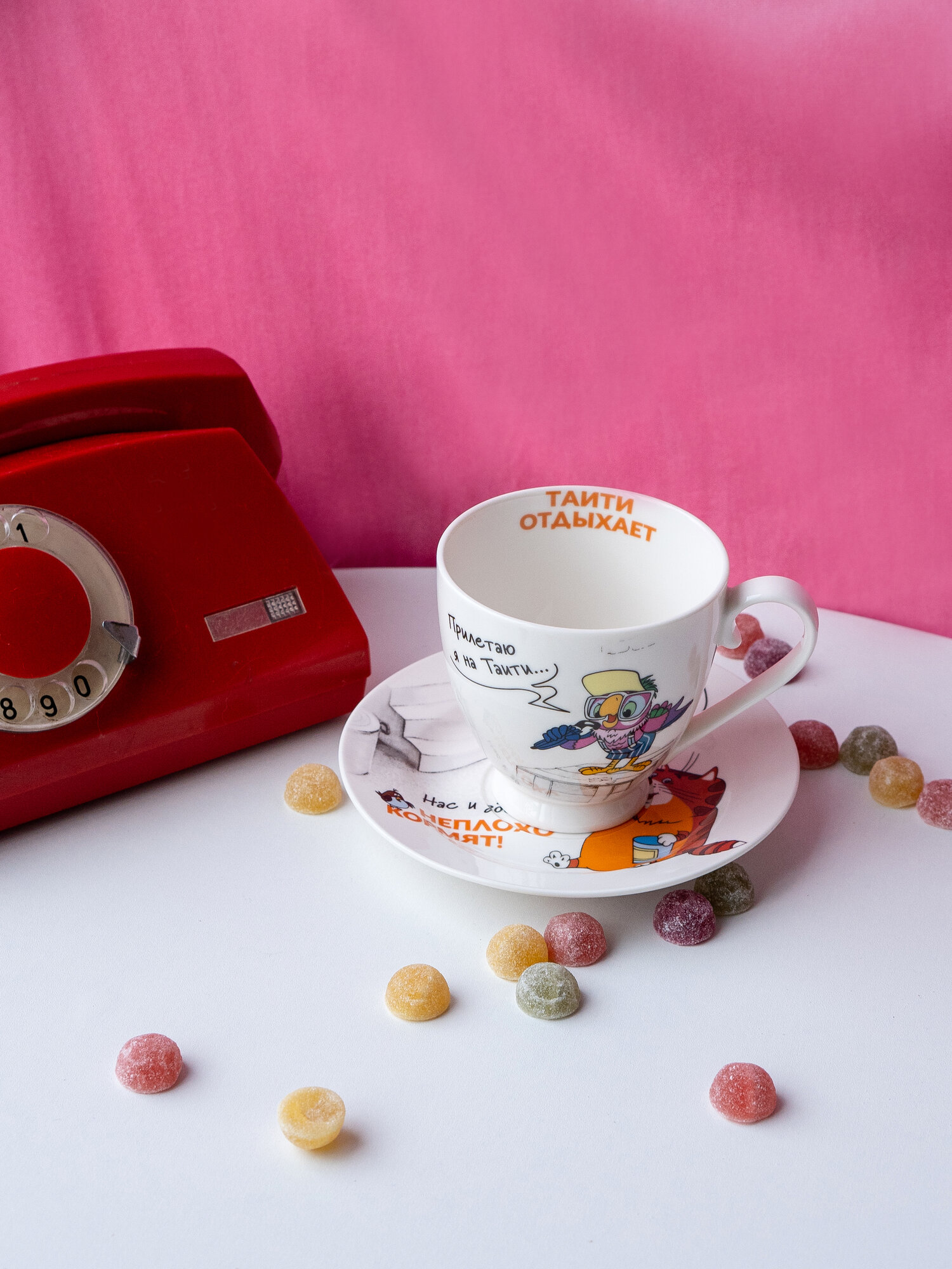 Купить Чайная пара фарфор "Попугай Кеша" 440 мл. в подарочной упаковке, чашка с блюдцем, чайный набор на 1 персону. Коралл.