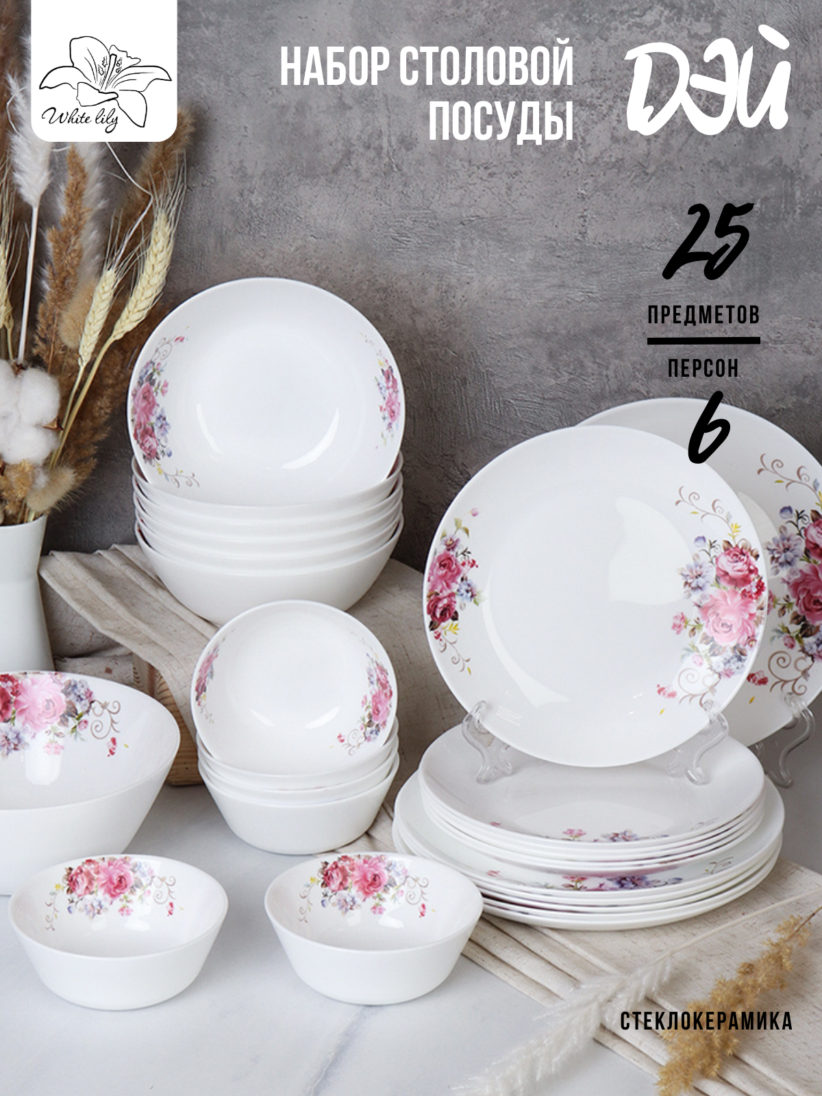 Купить Столовый набор посуды "Розовая композиция" (дэй) - 25 предметов, с салатниками