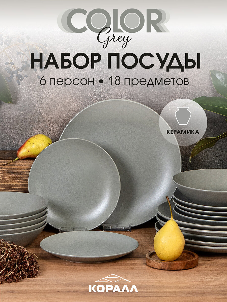 СохранитьНабор посуды на 6 персон 18 предметов керамика "Color grey", столовый сервиз обеденный интересное: