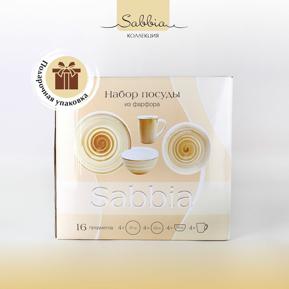 Купить Набор посуды из фарфора на 4 персоны 16 предметов "Sabbia", столовый сервиз обеденный в подарочной упаковке