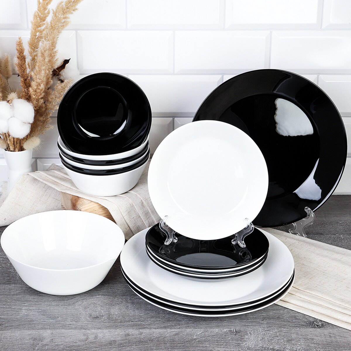 Столовый набор посуды "Инь и Ян" (евро) - 19 предметов / Черно-белый, обеданная тарелка 210 мм
