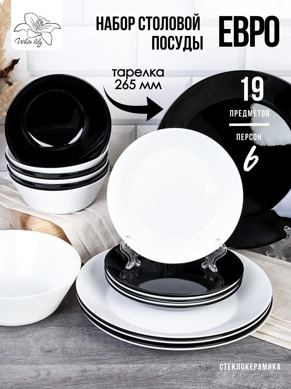 Столовый набор посуды "Инь и Ян" (евро) - 19 предметов / Черно-белый, обеденная тарелка 265 мм интересное: