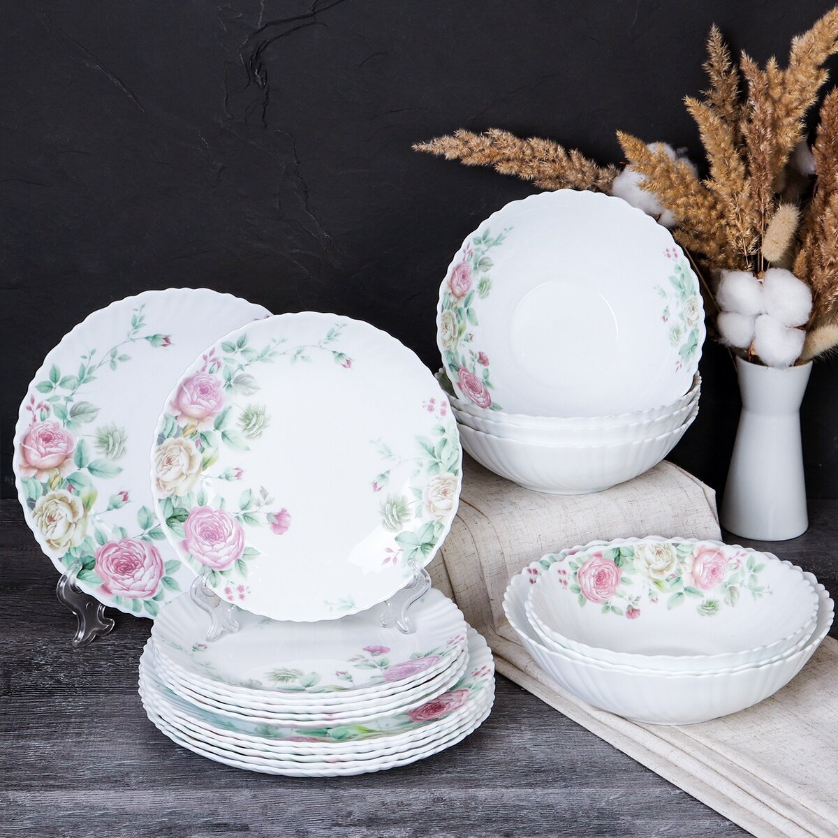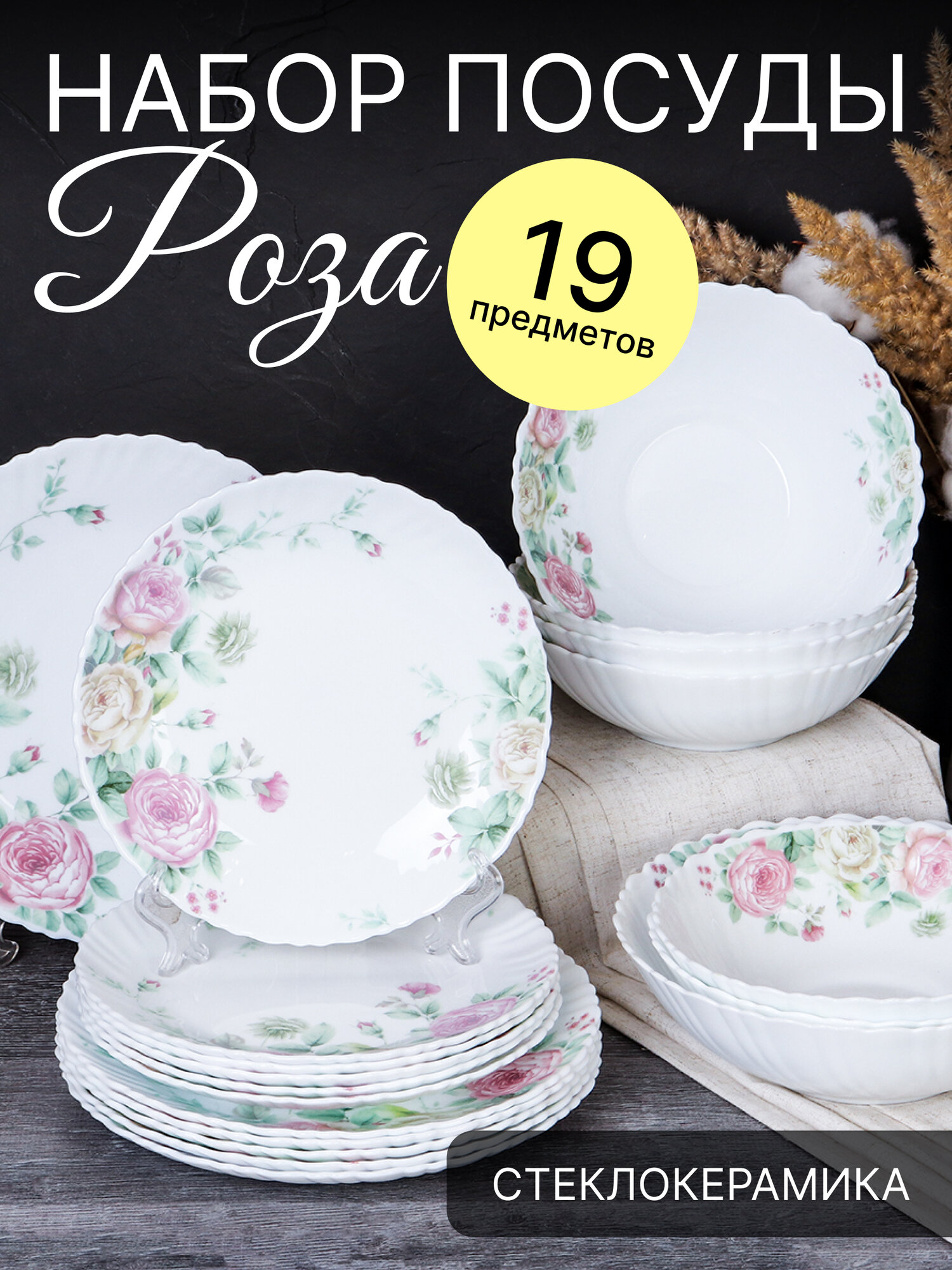 Набор столовой посуды WHITE LILY "Кустовая роза" 19 предметов на 6 персон интересное: