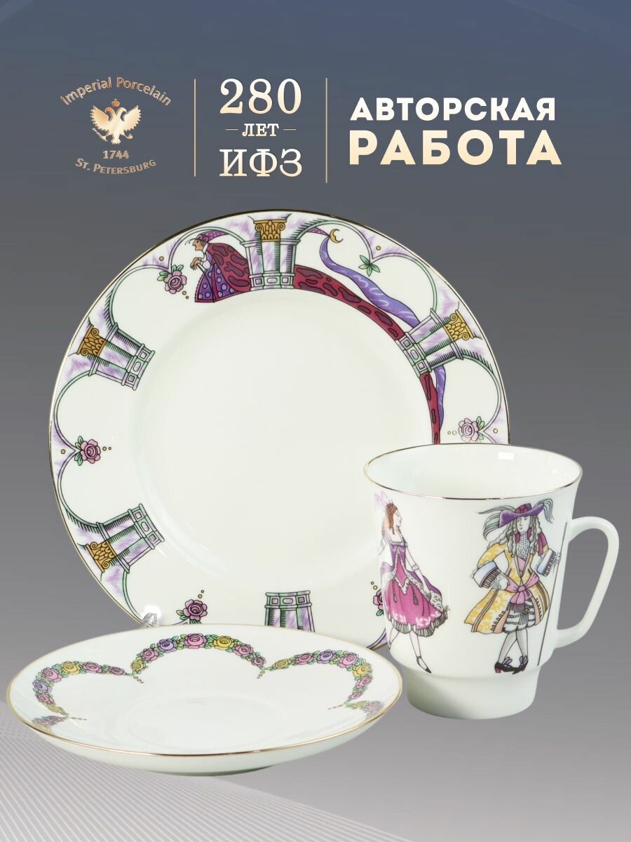 Кофейный набор 165 мл. Форма "Майская", рисунок "Балет. Жизель". Костяной фарфор. 3 предмета. Кофейная пара с десертной тарелкой. Императорский фарфоровый завод ИФЗ ЛФЗ