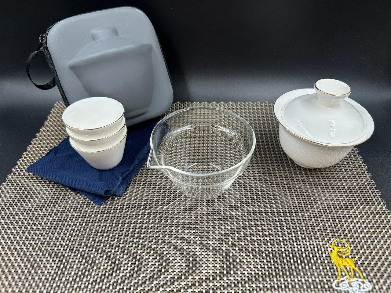 Купить Набор дорожный для чайной церемонии «Белоснежный фарфор» (白瓷旅行包) с золотым оформлением, 6 предметов