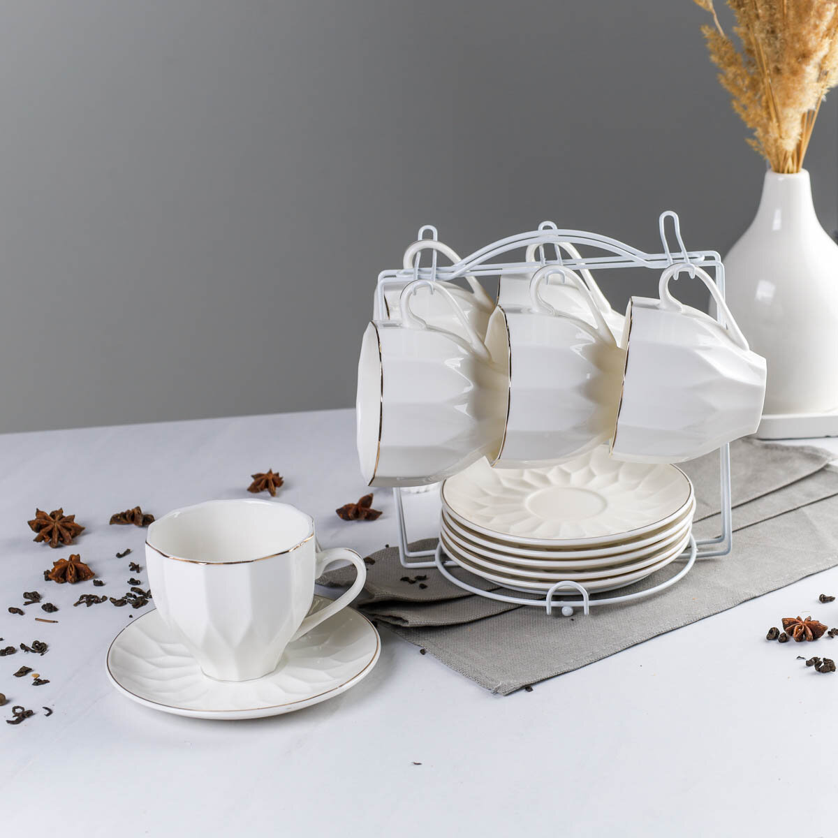 Купить Чайный набор 12 предметов "Фактурный" на подставке, сервиз на 6 персон из фарфора