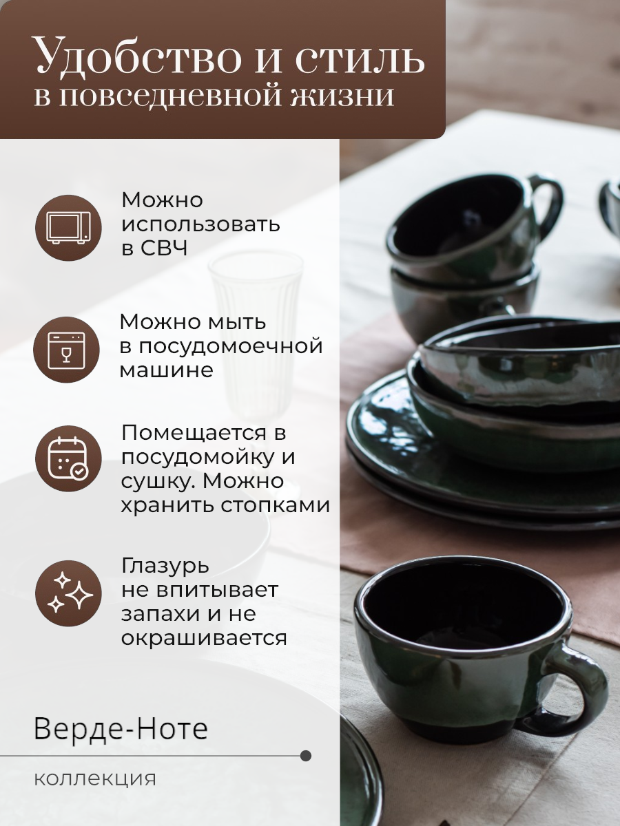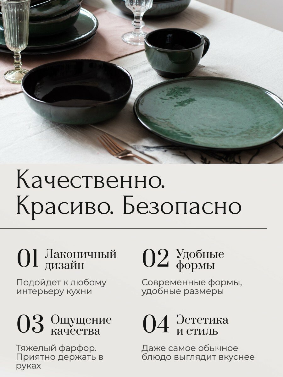 Набор посуды столовой на 4 персоны с кружками, 16 предметов "Верде-Ноте", фарфор, сервиз обеденный темно-зеленый