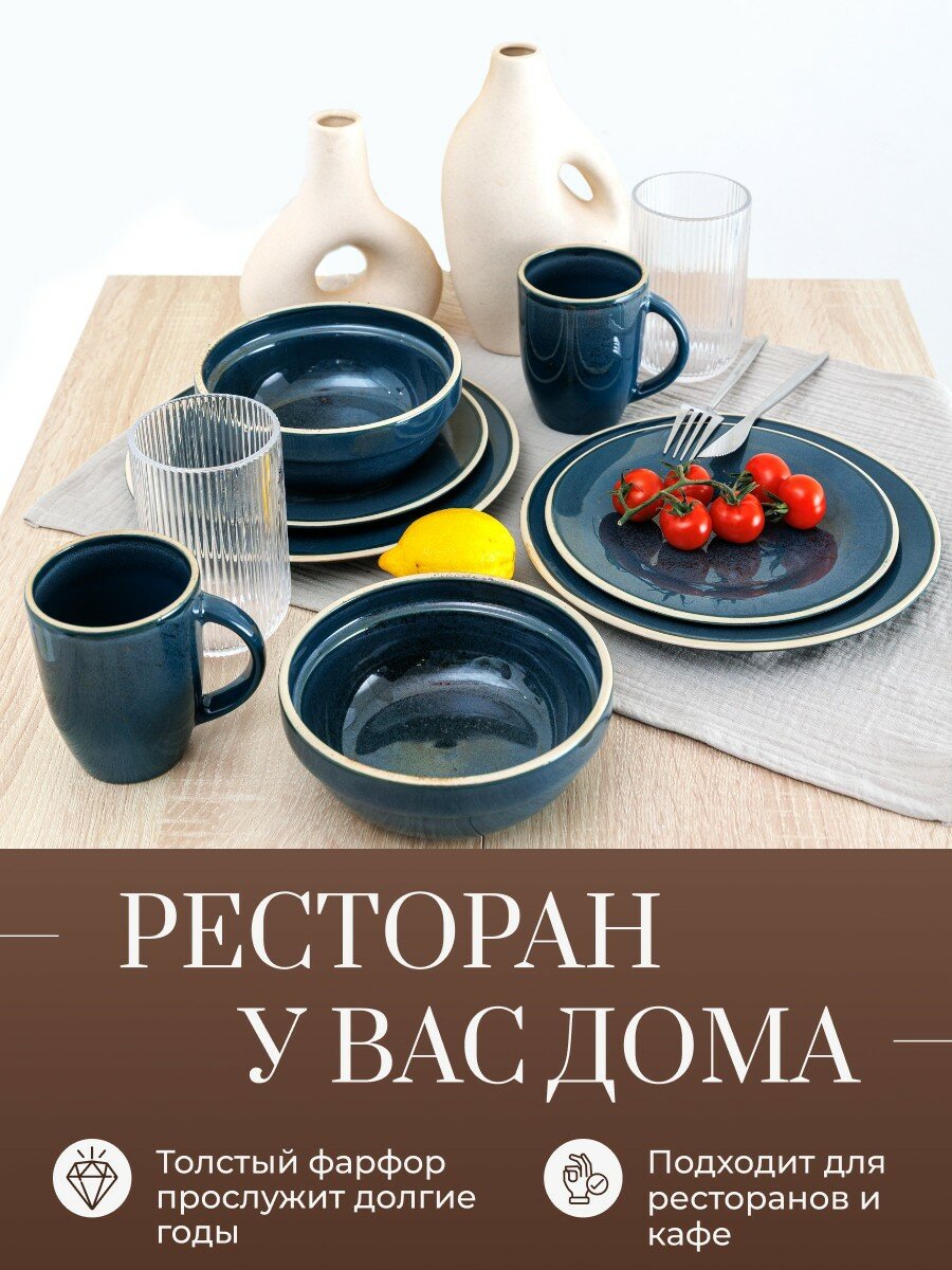 Набор посуды столовой на 6 персон с кружками, 24 предмета "Бордер", фарфор, сервиз обеденный Блу Реаттиво