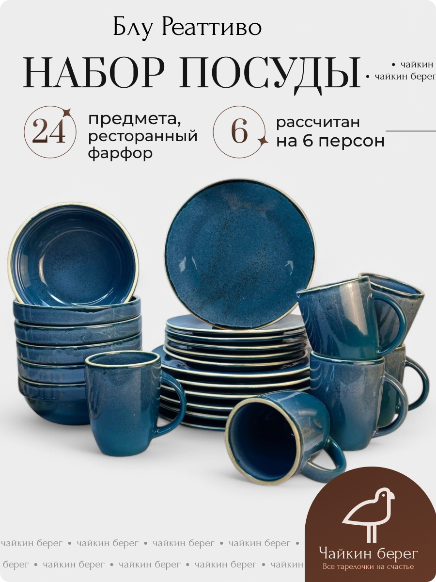 СохранитьНабор посуды столовой на 6 персон с кружками, 24 предмета "Блу Реаттиво", фарфор, сервиз обеденный, цвет синий интересное: