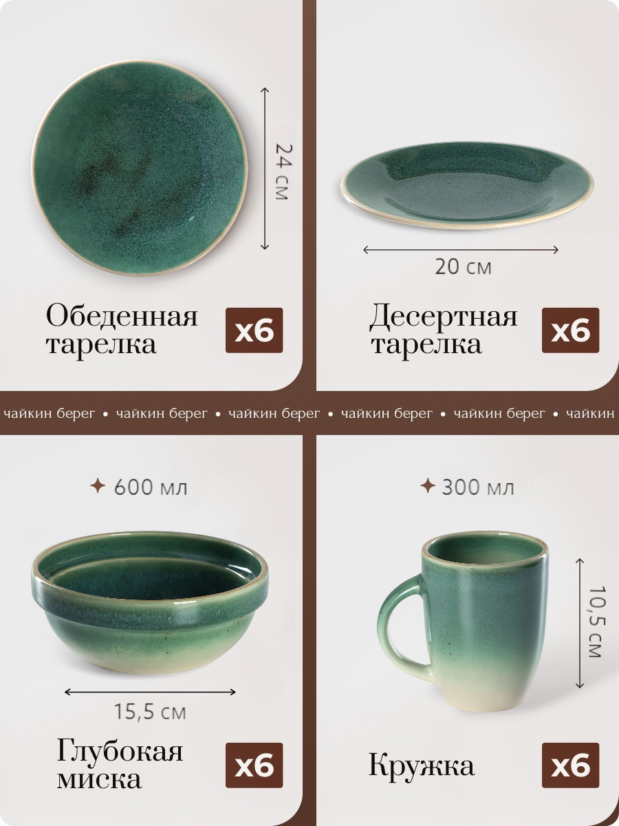 СохранитьНабор посуды столовой на 6 персон с кружками, 24 предмета "Эрбосо Реаттиво", фарфор, сервиз обеденный зеленый интересное: