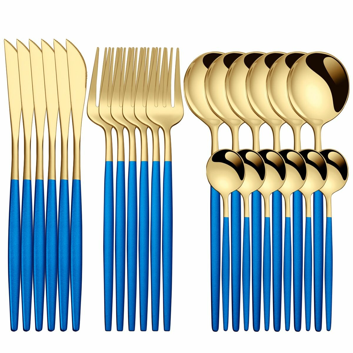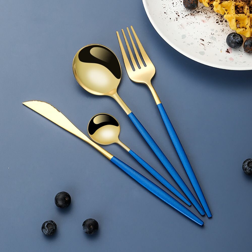 Набор посуды, набор из 24 предметов с антибактериальным покрытием, комбинация ножей и вилок, синий с золотом