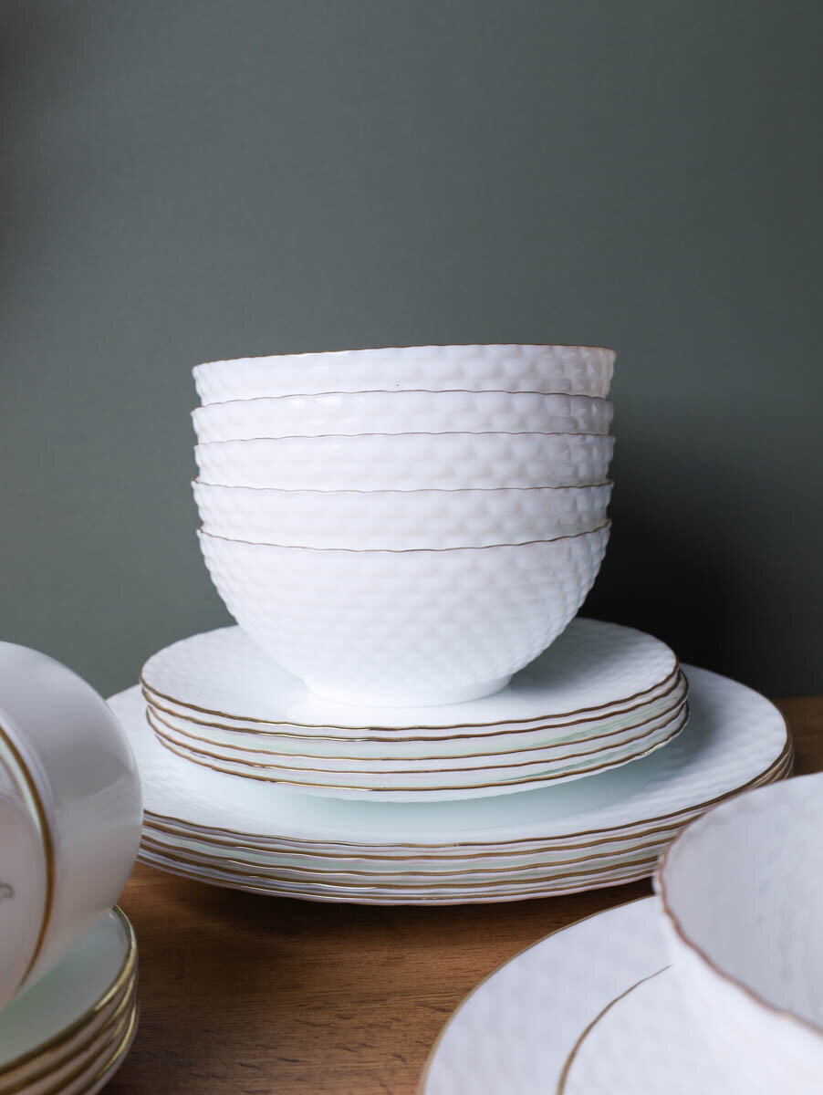 Столовый набор посуды 30 предметов/ Тарелки с чайным набором Фактурные белые с золотом интересное: