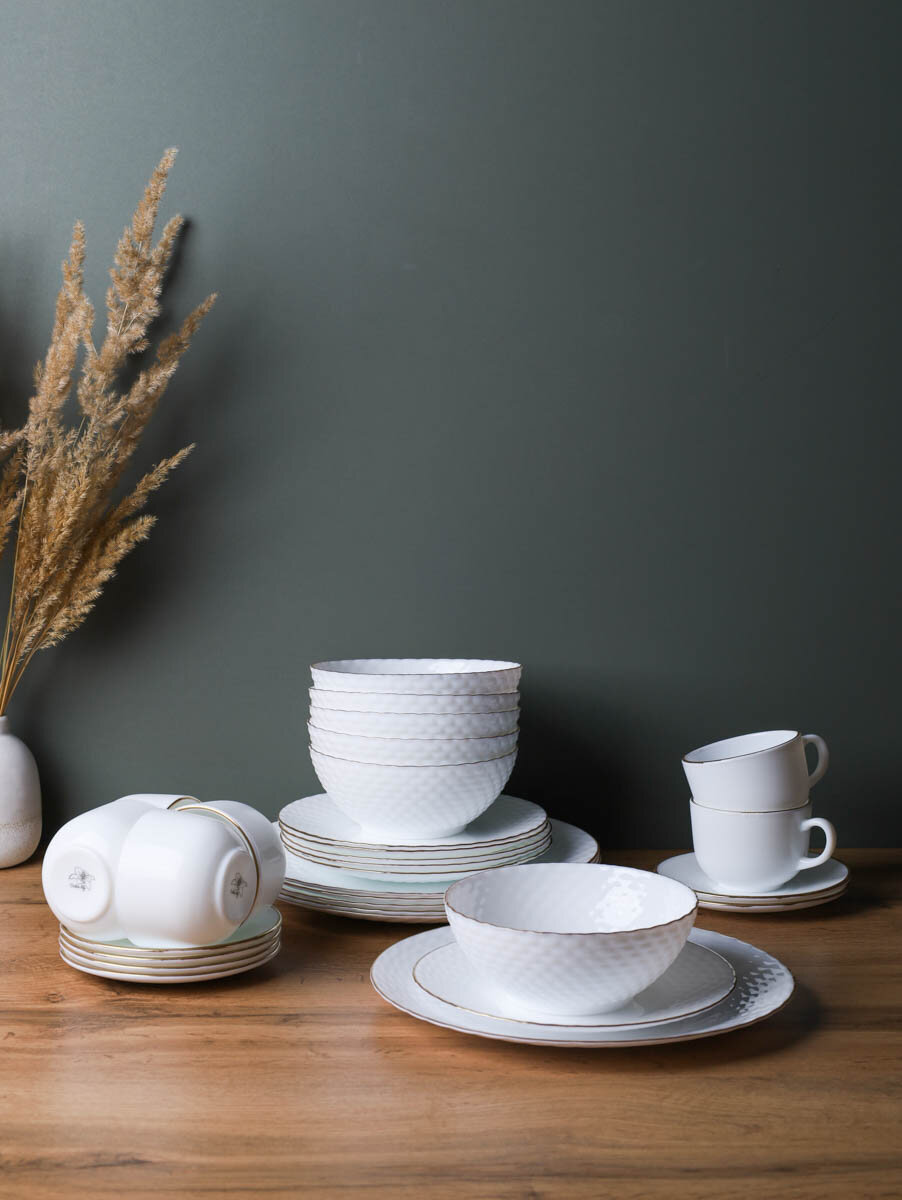 Купить Столовый набор посуды 30 предметов/ Тарелки с чайным набором Фактурные белые с золотом