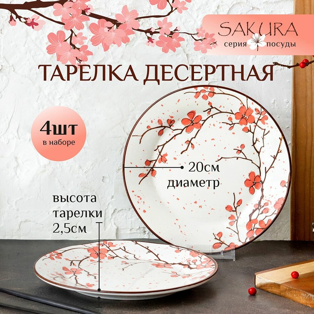 Набор тарелок из фарфора 20см 4 шт. "Sakura", тарелки десертные столовые закусочные интересное: