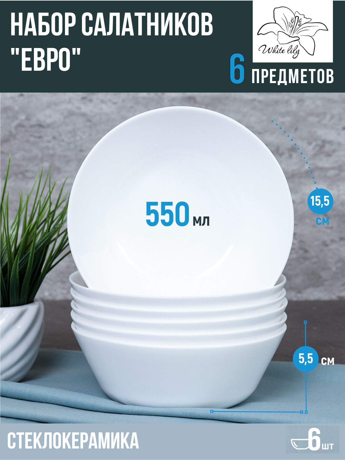 Салатник WHITE LILY "Евро", стеклокерамика, набор 6 штук, тарелка глубокая, 550мл, белый интересное: