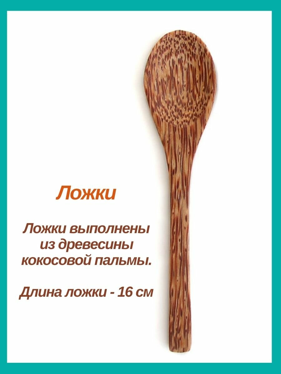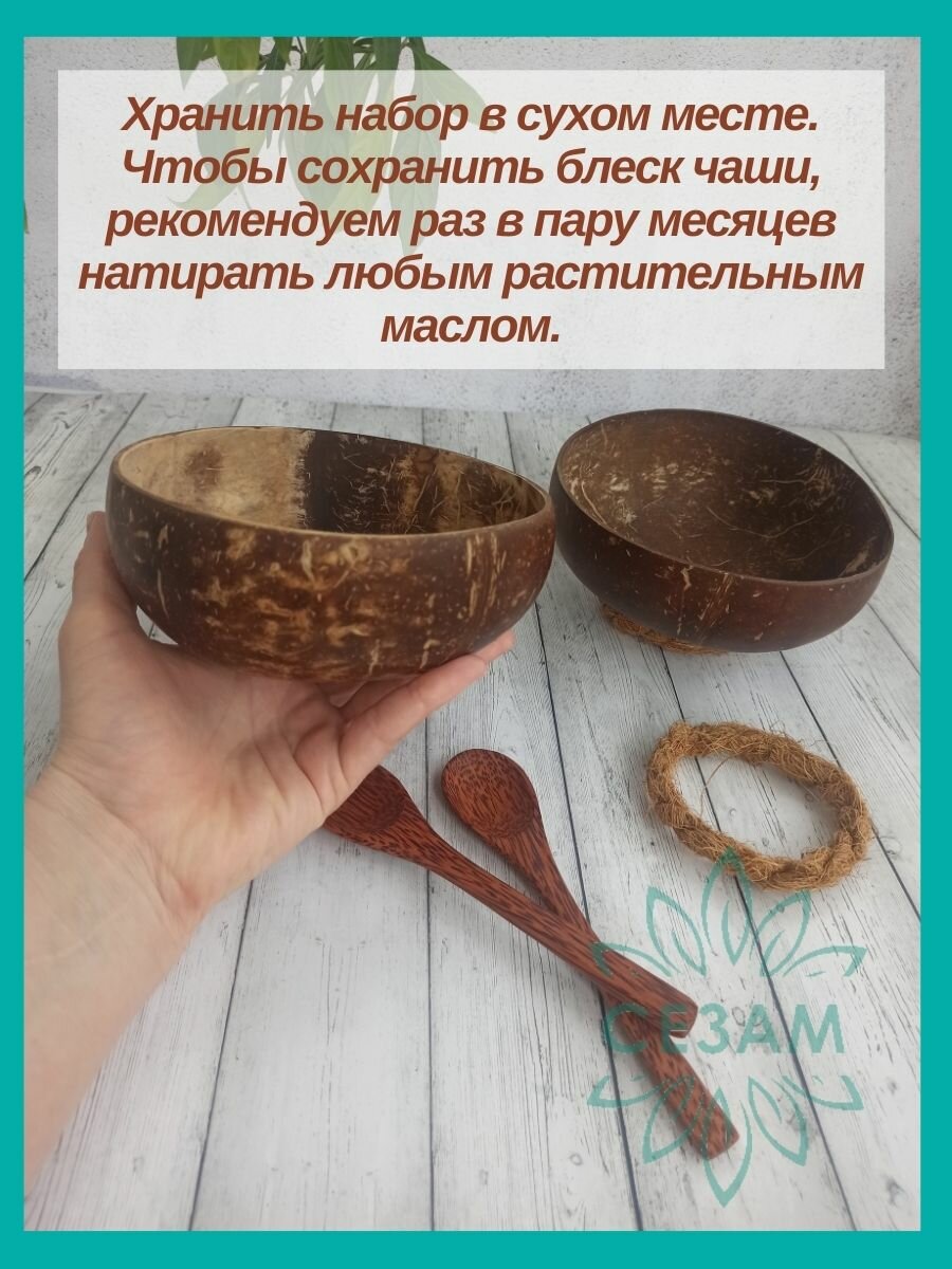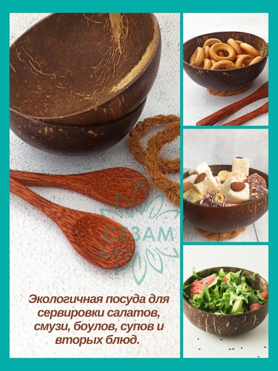 Набор эко посуды, 2 пиалы из скорлупы кокоса, 2 деревянные ложки, 2 подставки под кокосовые миски интересное: