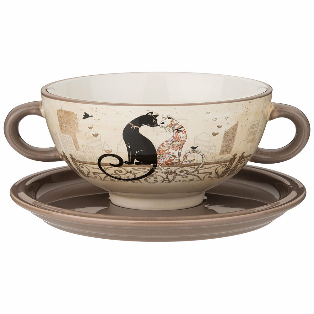 Тарелка Agness "Парижские коты", бульонница, суповая, с блюдцем, 550 мл, керамика интересное: