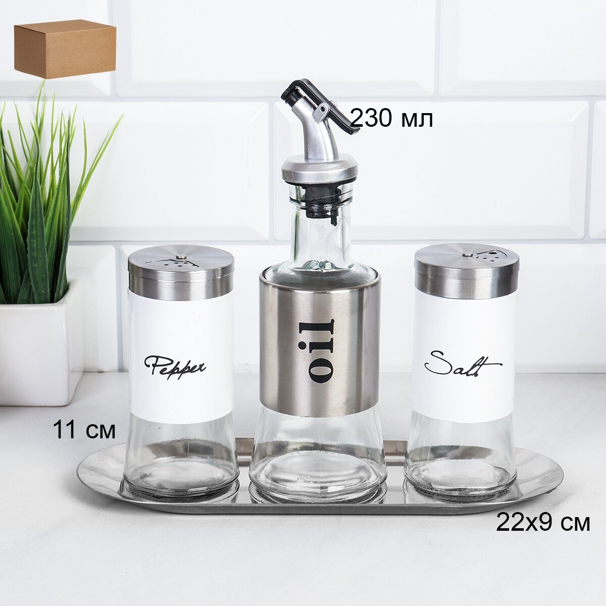 Набор для специй на подставке 3 предмета / солонка, перечница, бутылка для масла интересное: