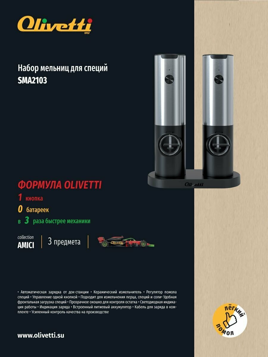 Набор мельниц электрических Olivetti SMA2103 с керамическим измельчителем и зарядной станцией, регулировка помола интересное: