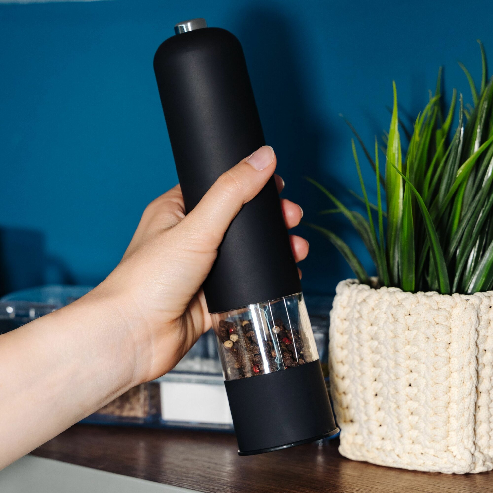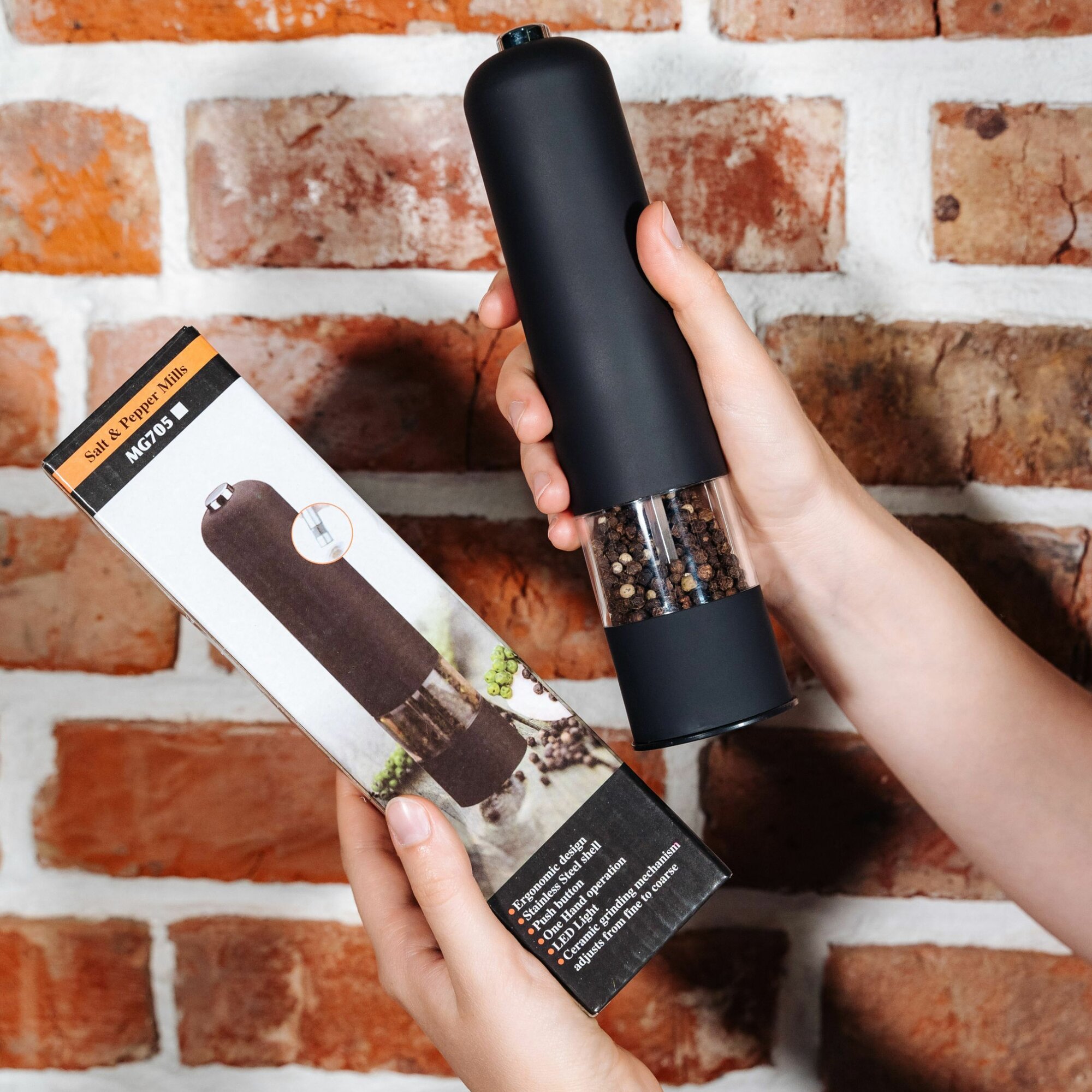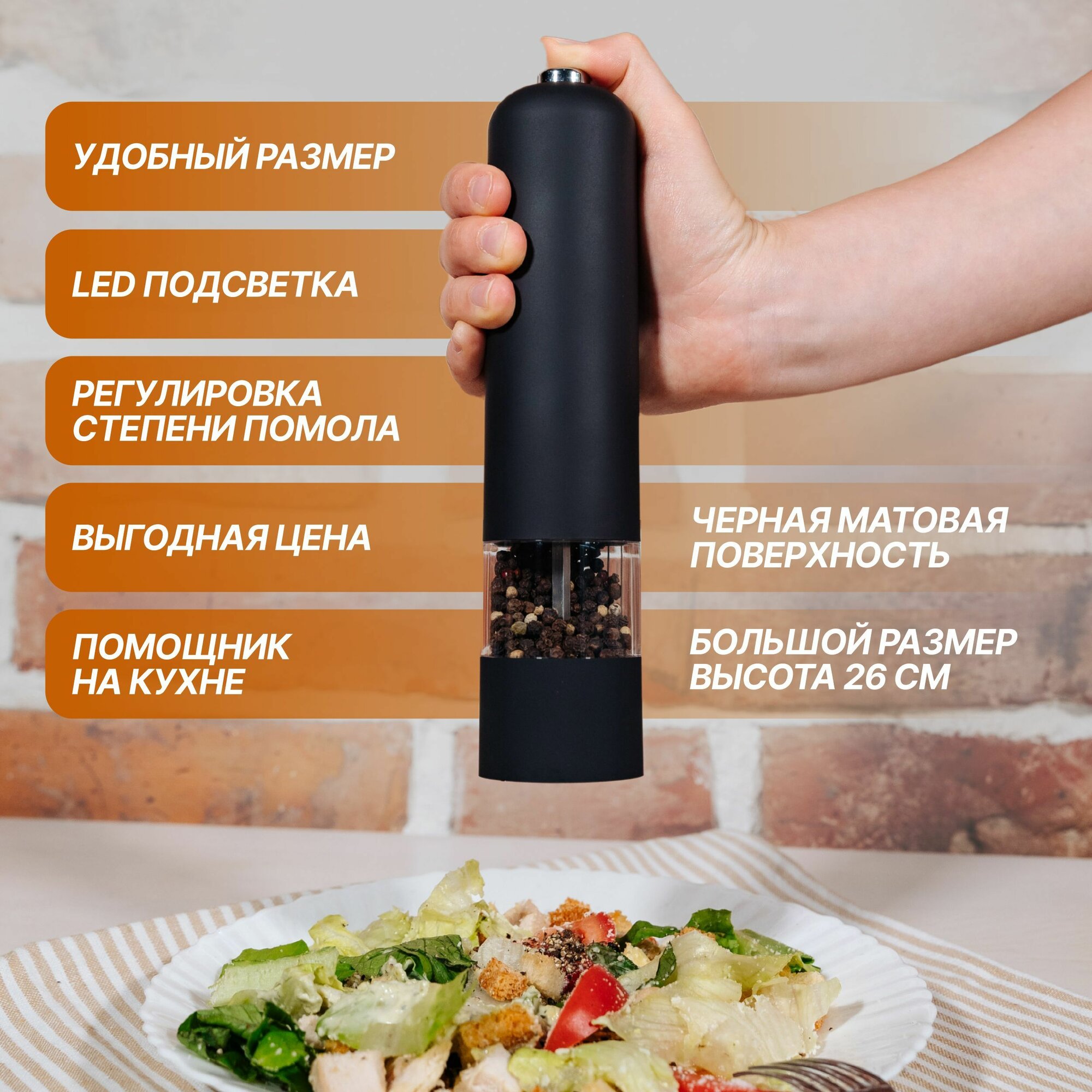 Мельница для специй электрическая, высота 23 см, солонка и перечница чёрная. Электромельница для соли и перца интересное: