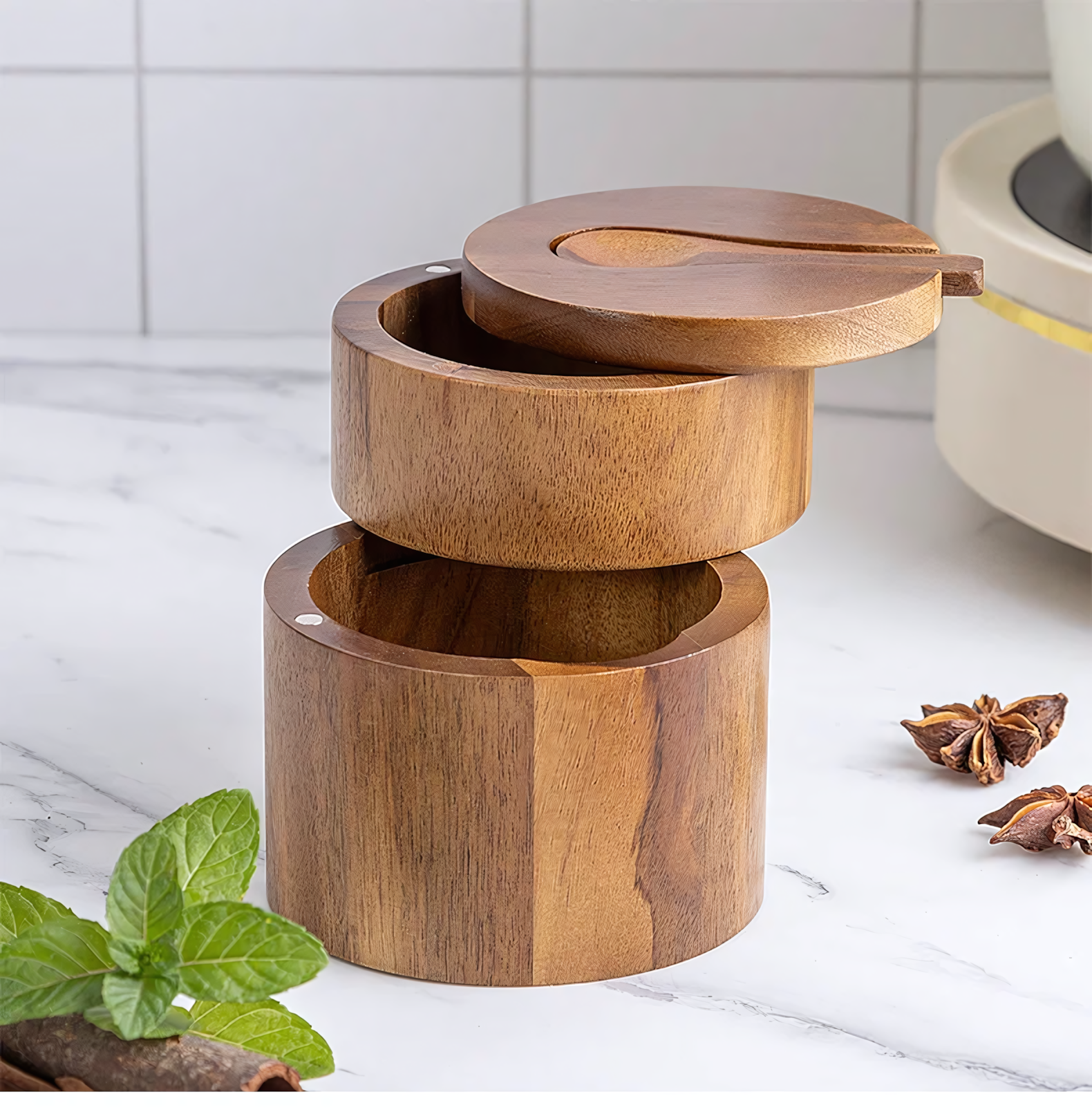 Купить Емкость для специй двойная из дерева акации, 10.5х9 см, поворотный механизм