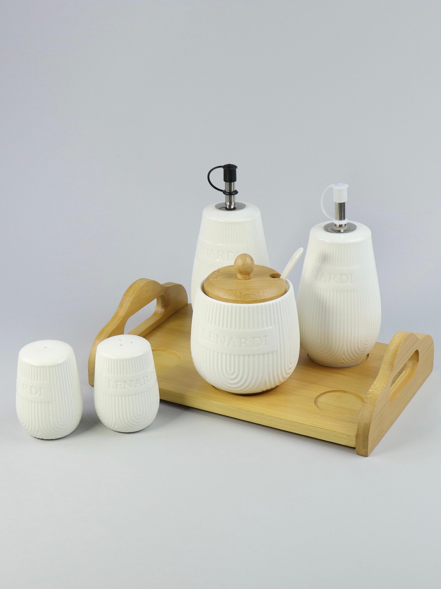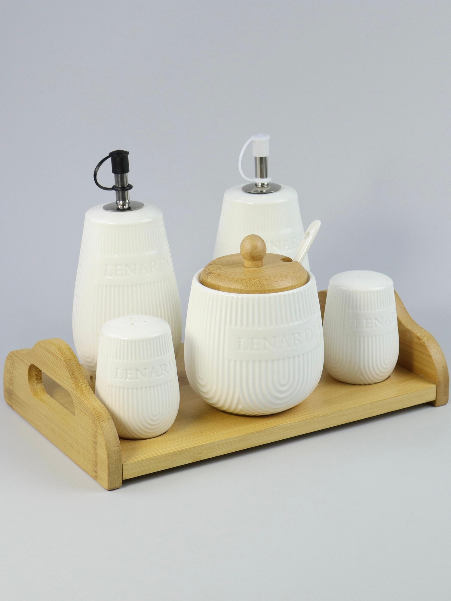 Купить Набор для специй с сахарницей и бутылки для масла и уксуса. 5 предметов на подставке "Bamboo". Фарфор. Подарочная упаковка. Lenardi.