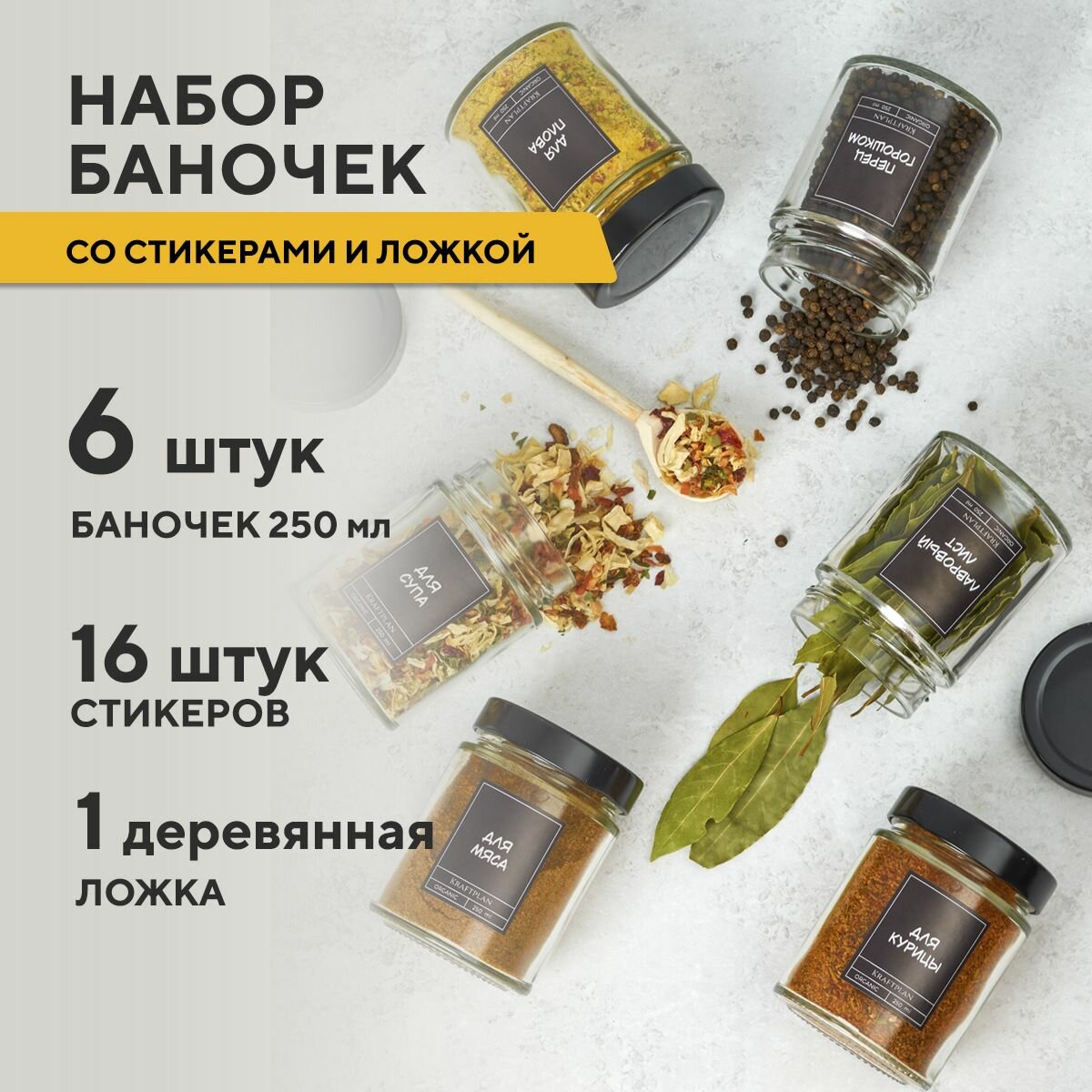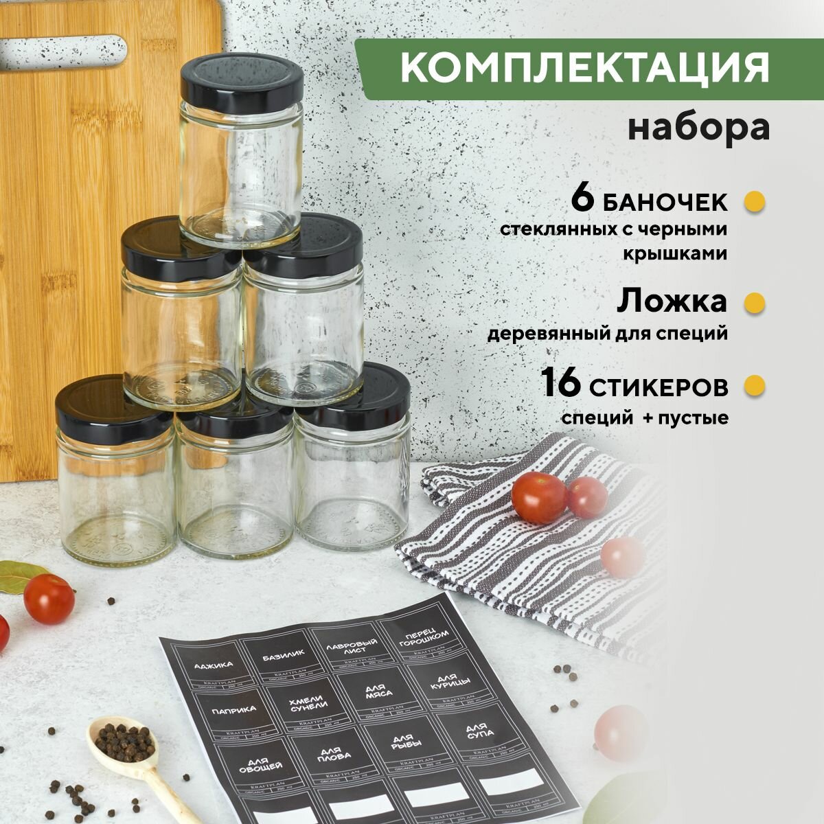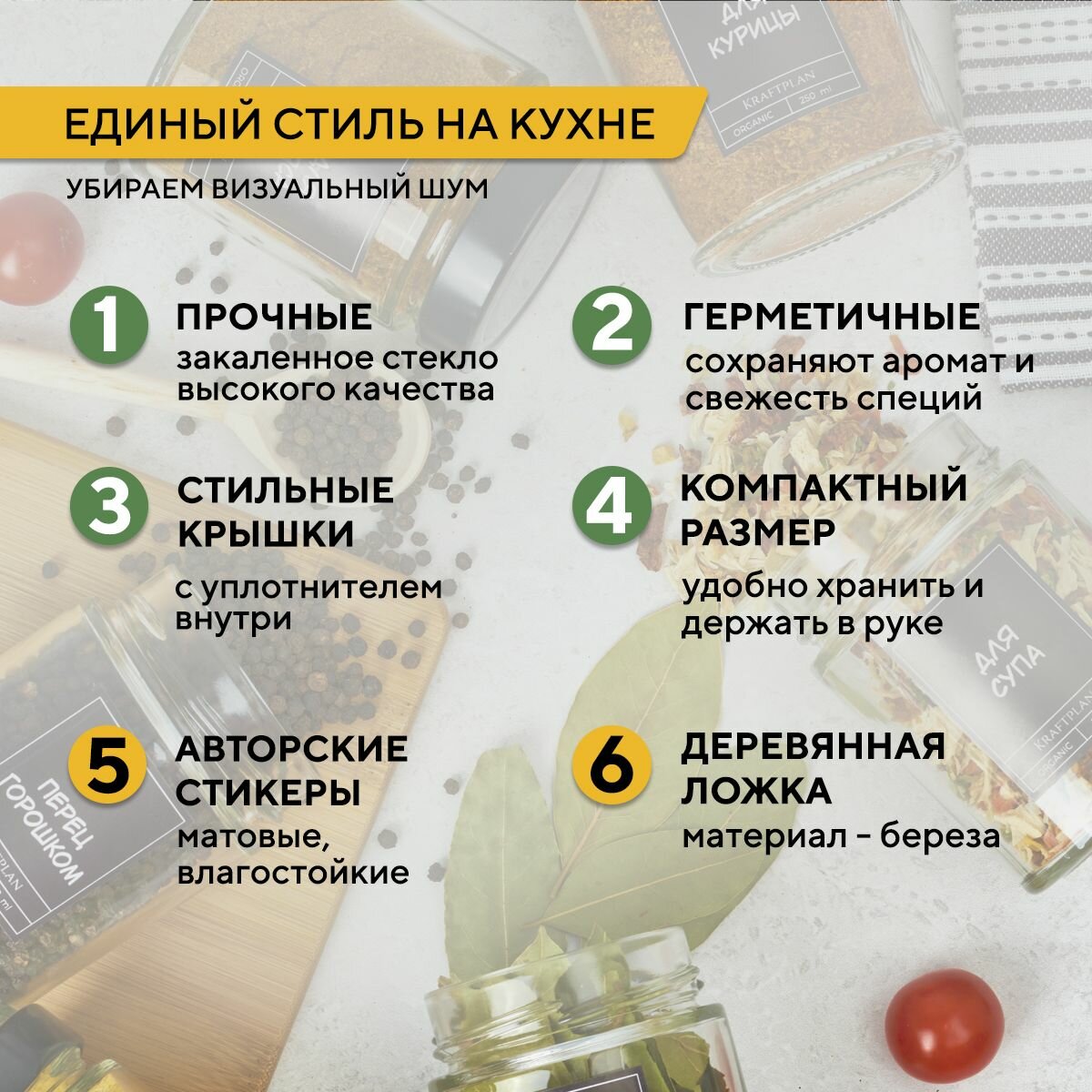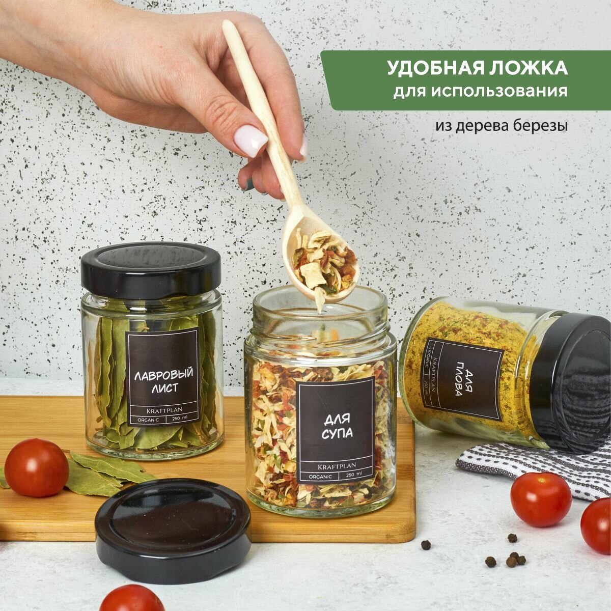 Баночки для специй стекло KRAFTPLAN/ Набор емкостей под специи, Банки для приправ с наклейками и деревянной ложкой, 6 шт интересное: