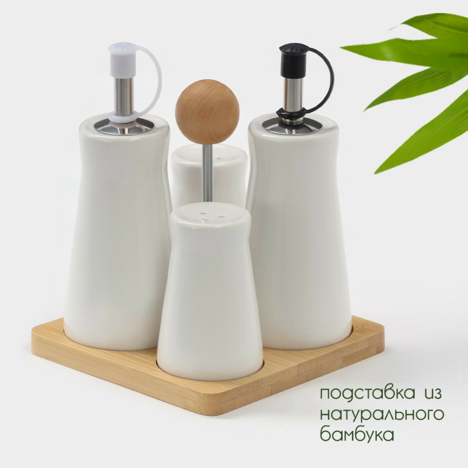 Купить Солонка и перечница фарфоровая с дозаторами для масла BellaTenero, набор для специй на бамбуковой подставке