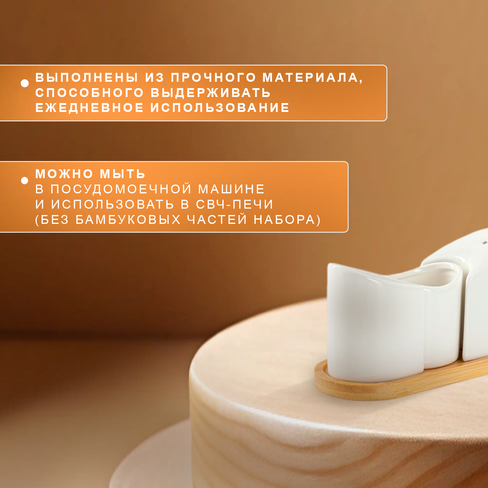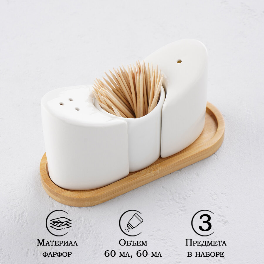Набор для специй на бамбуковой подставке 3 предмета: солонка 100 мл, перечница 100 мл, салфетница, фарфор, белый