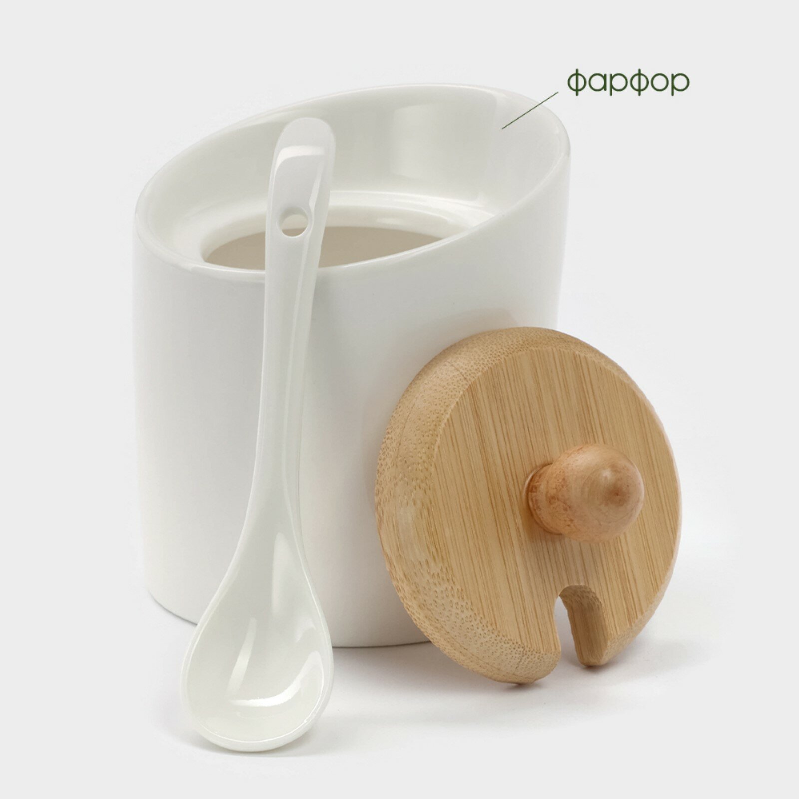 Набор для специй и соусов, 8 предметов: 2 ёмкости 250 мл, 5 баночек для специй, на бамбуковой подставке, фарфор, белый