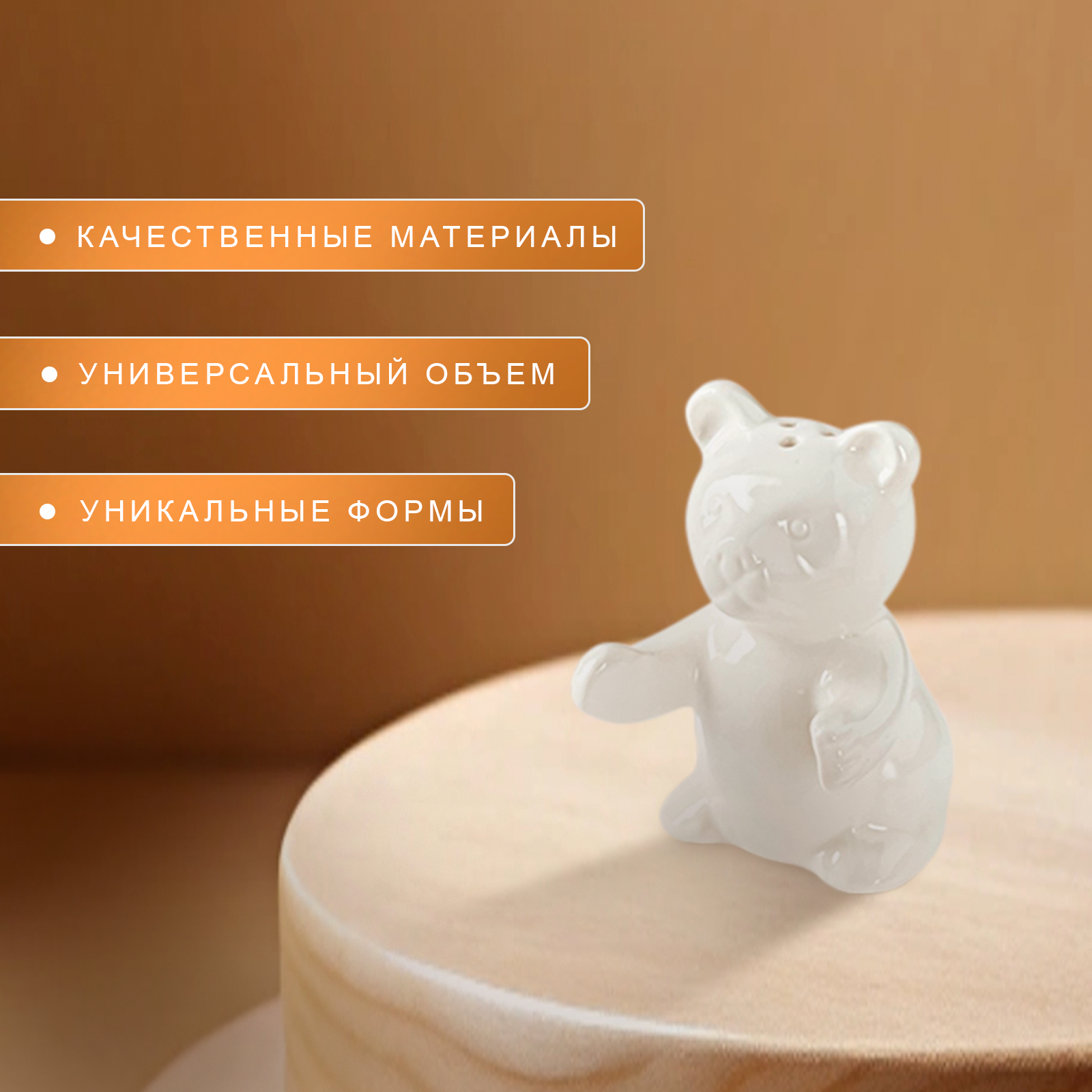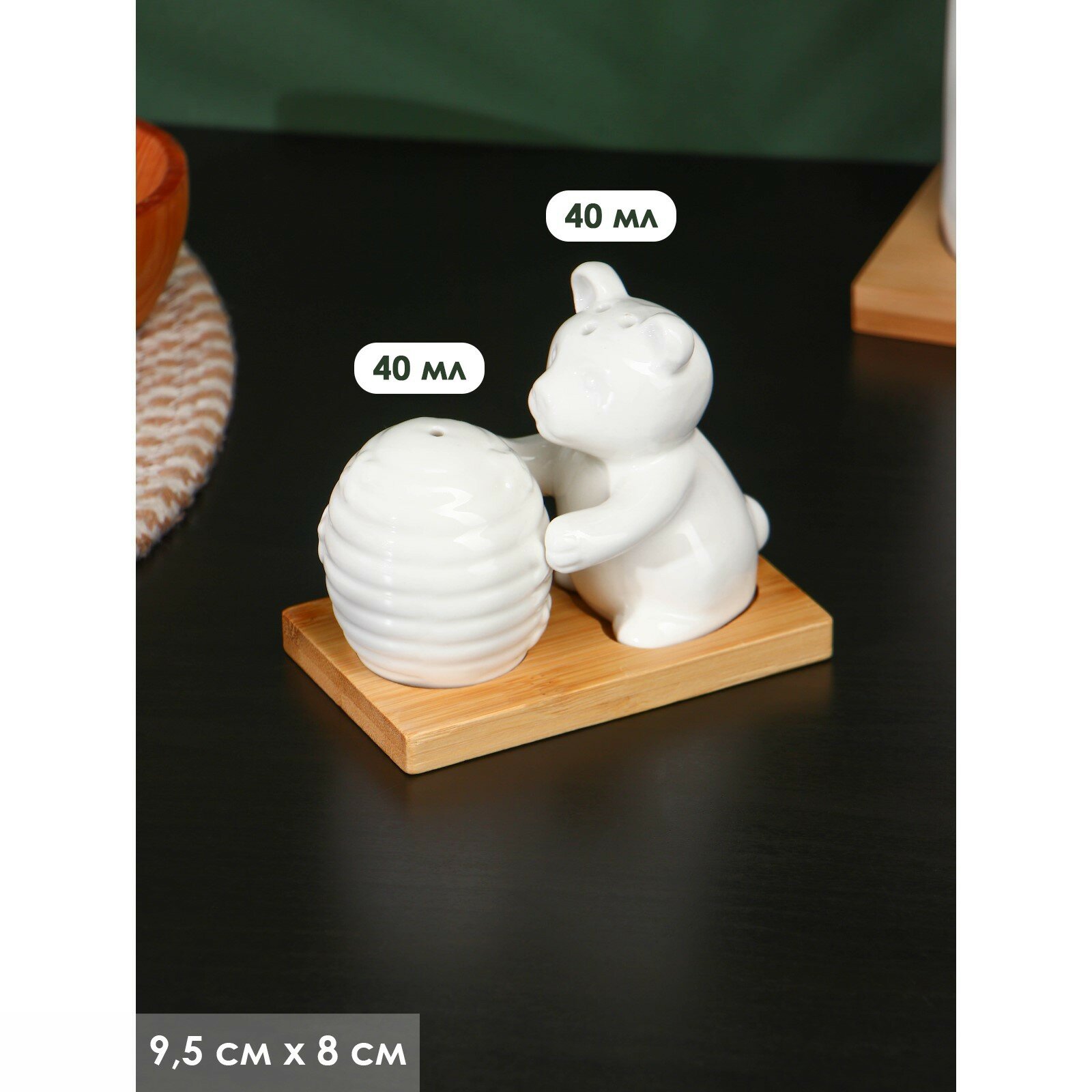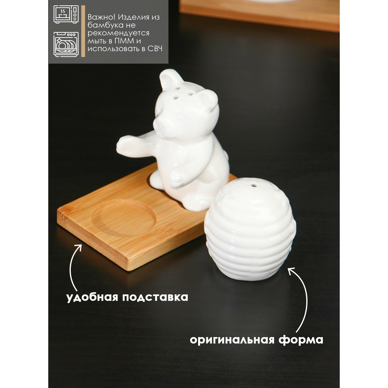Набор фарфоровый для специй на деревянной подставке BellaTenero «Медведица и медвежонок», 2 предмета: солонка 15 мл, перечница 35 мл, цвет белый