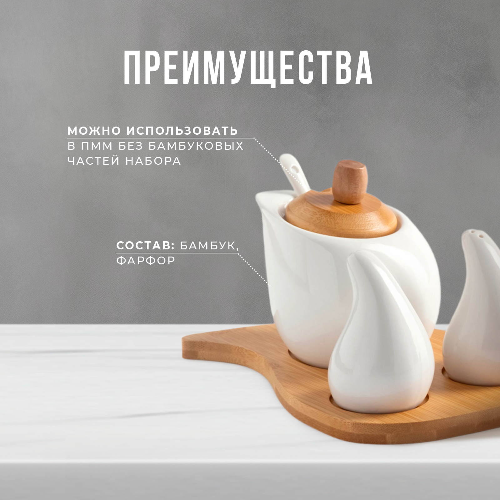 Набор для специй и соусов, 8 предметов: 2 ёмкости 250 мл, 5 баночек для специй, на бамбуковой подставке, фарфор, белый