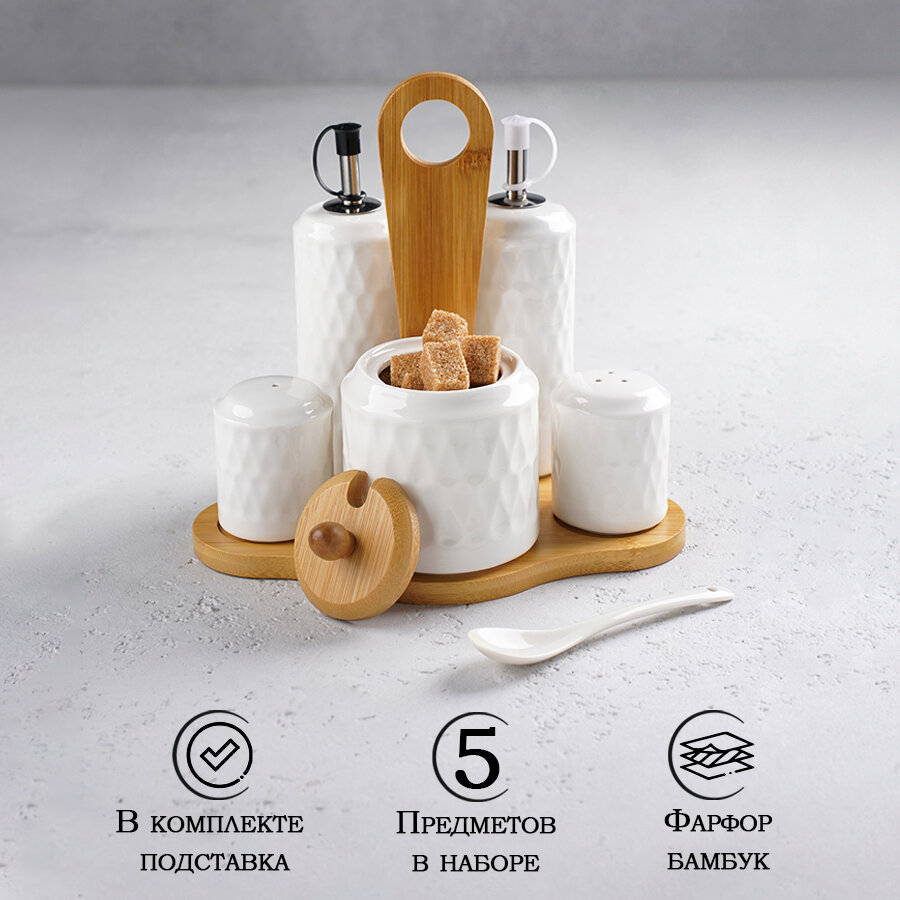Набор для специй и соусов, 8 предметов: 2 ёмкости 250 мл, 5 баночек для специй, на бамбуковой подставке, фарфор, белый