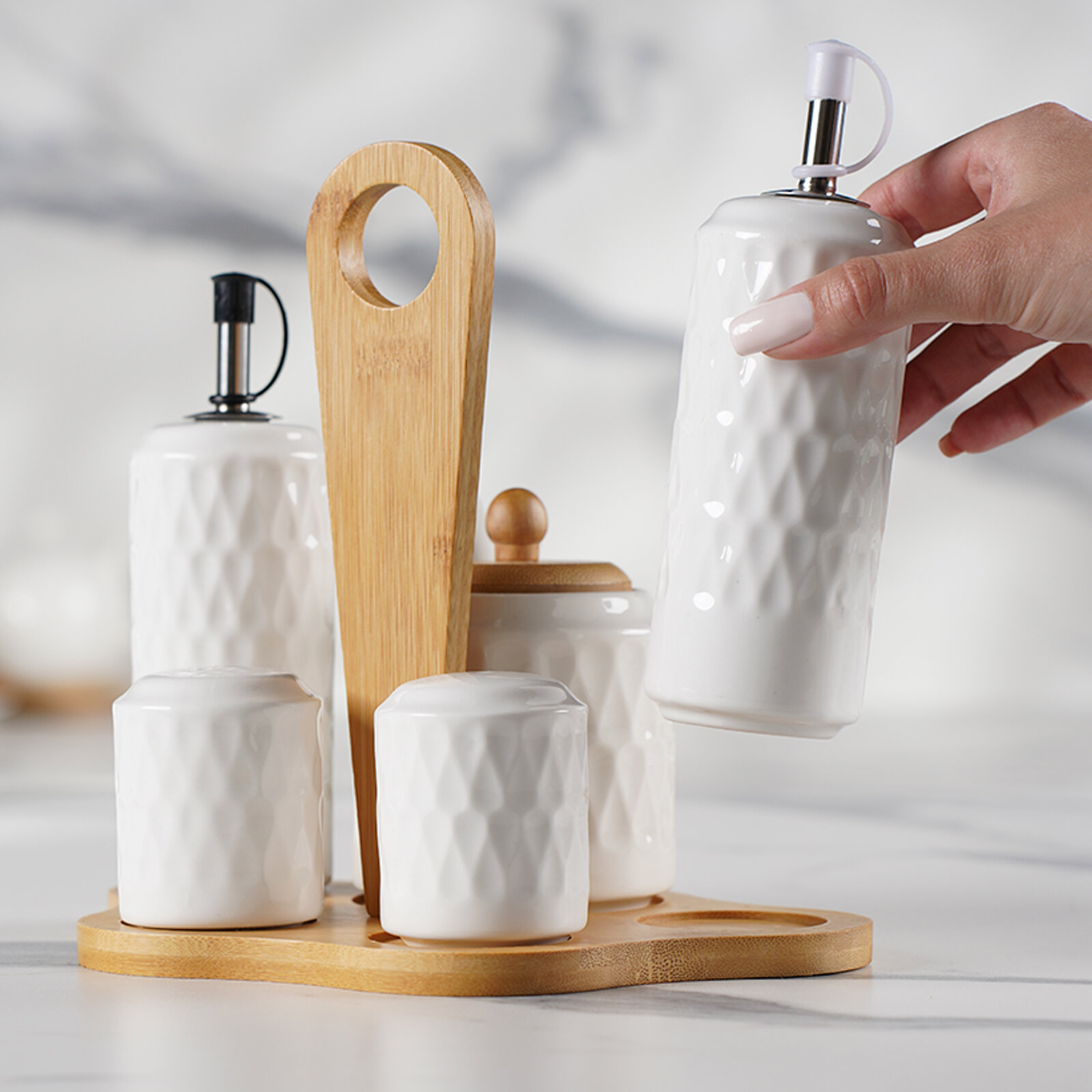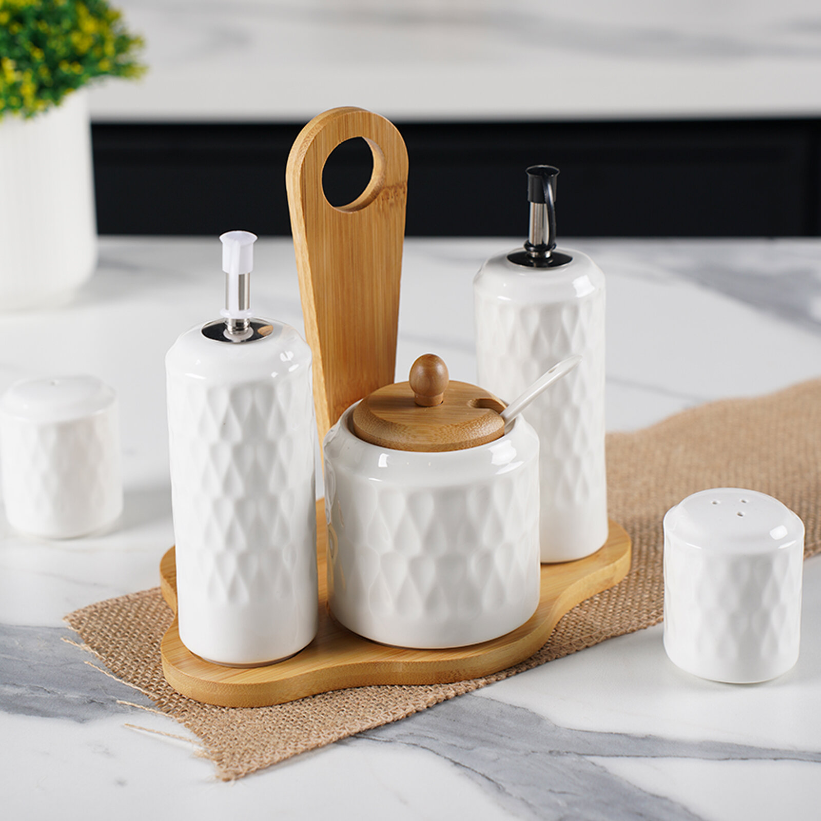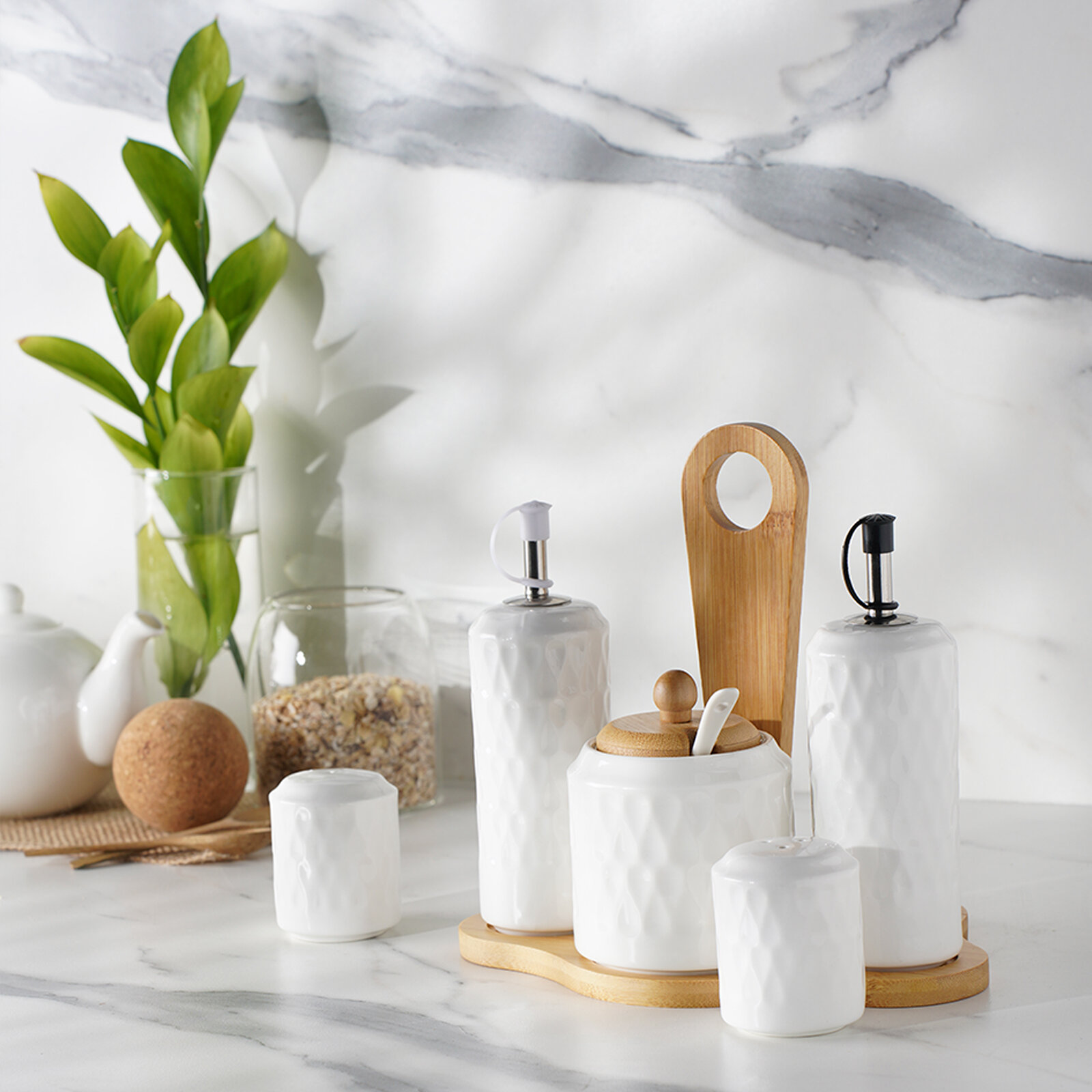 Солонка и перечница фарфоровая с дозаторами для масла BellaTenero, набор для специй на бамбуковой подставке