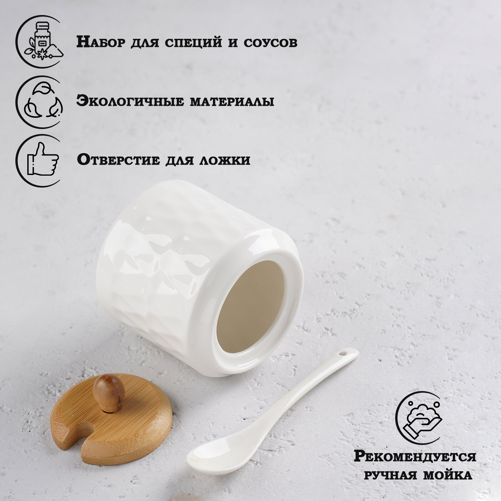 Набор керамический для специй на деревянной подставке 3 предмета: солонка 70 мл, перечница 70 мл, салфетница, белый