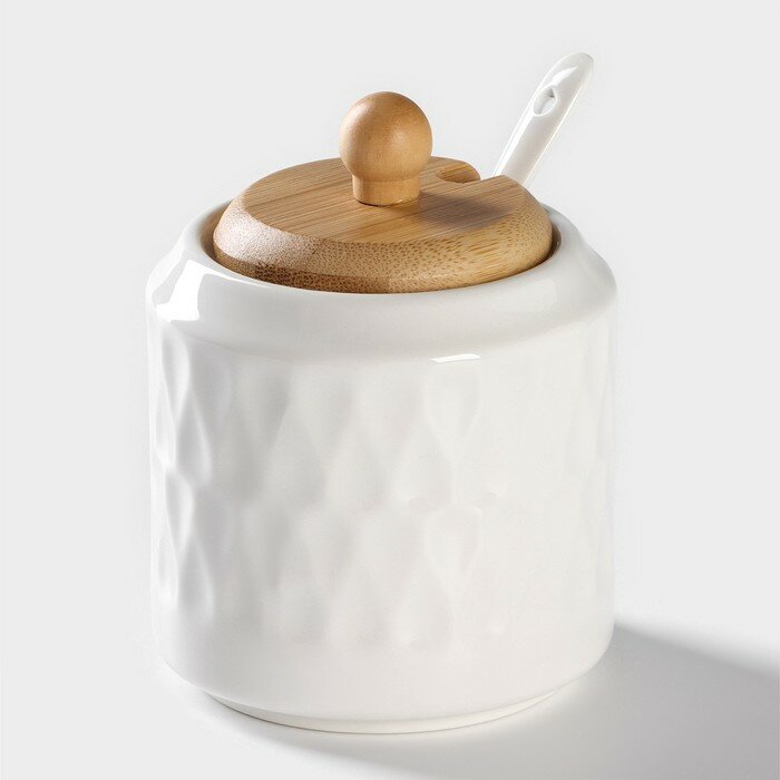 Набор керамический для специй на деревянной подставке Доляна "Эстет. Герда", 3 предмета: солонка, перечница, сахарница с ложкой