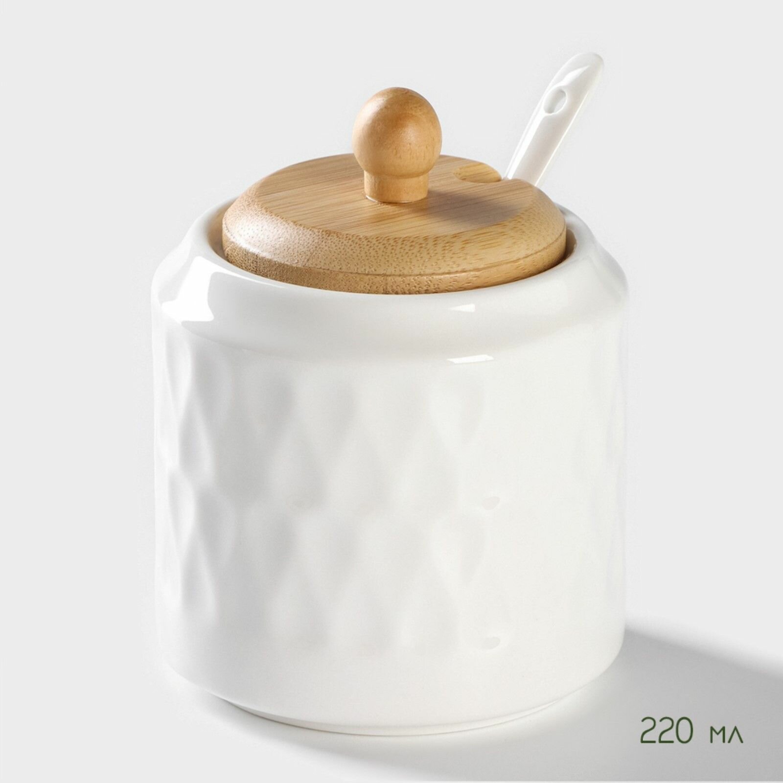 Купить Набор керамический для специй на деревянной подставке Доляна "Эстет. Герда", 3 предмета: солонка, перечница, сахарница с ложкой