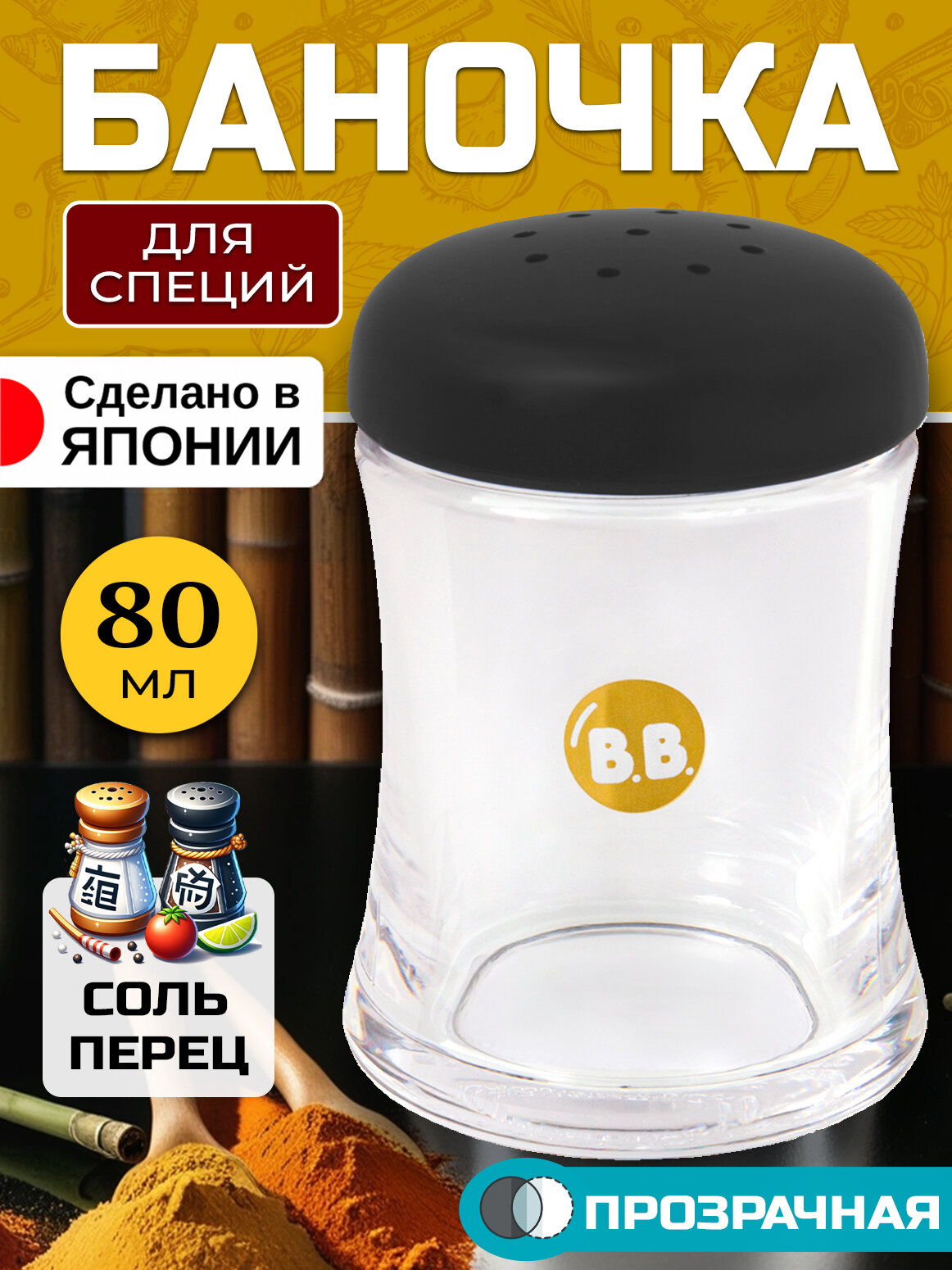 Баночка для специй / Солонка / Перечница 80 мл, Д5,1х7,8 см с черной крышкой интересное: