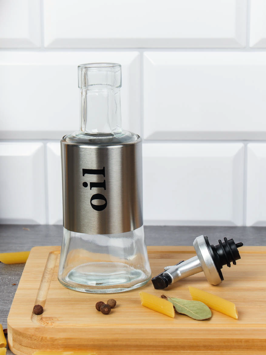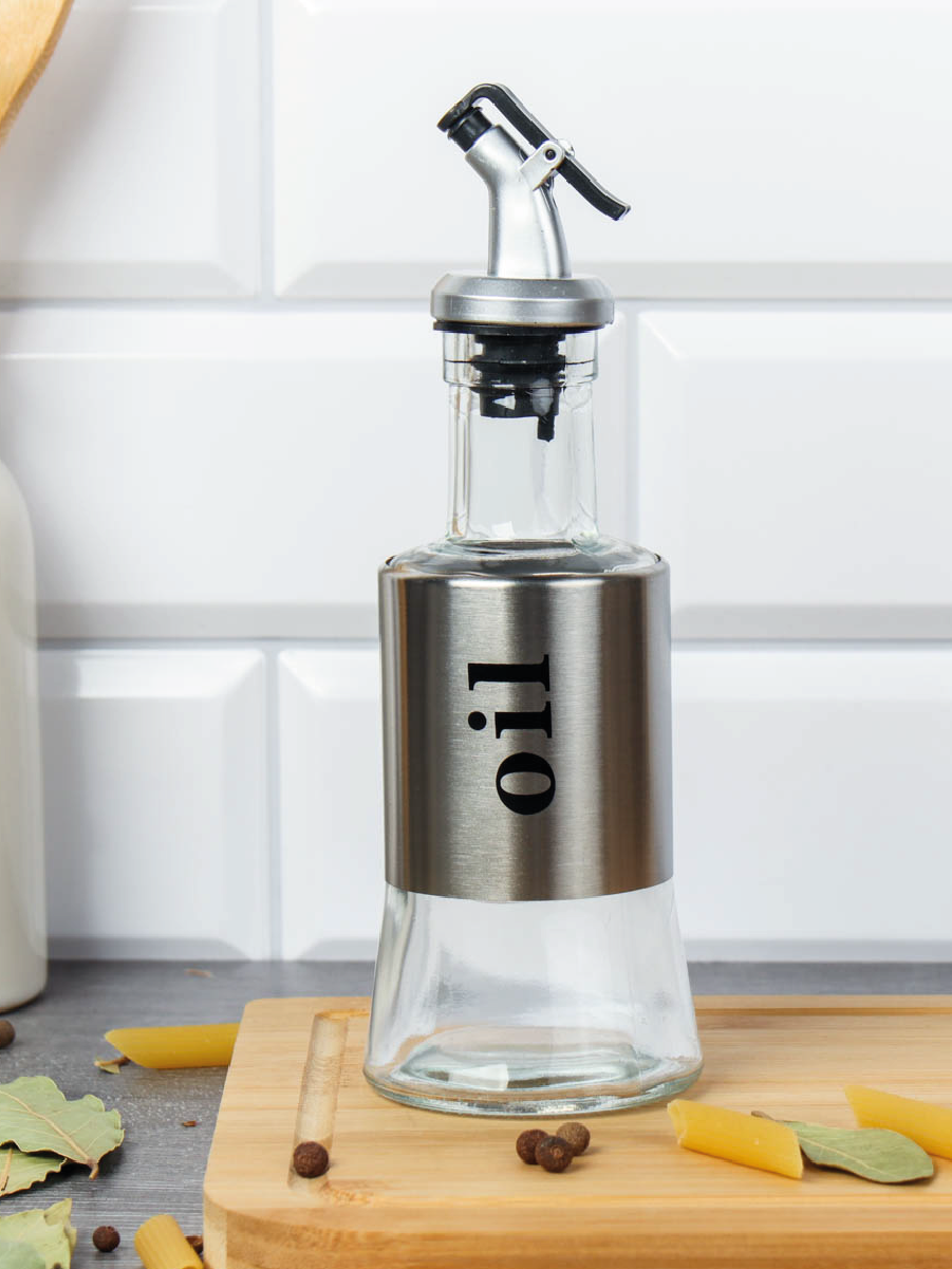 Купить Бутылка для масла с дозатором, 200 мл, стекло, прозрачная с металлом