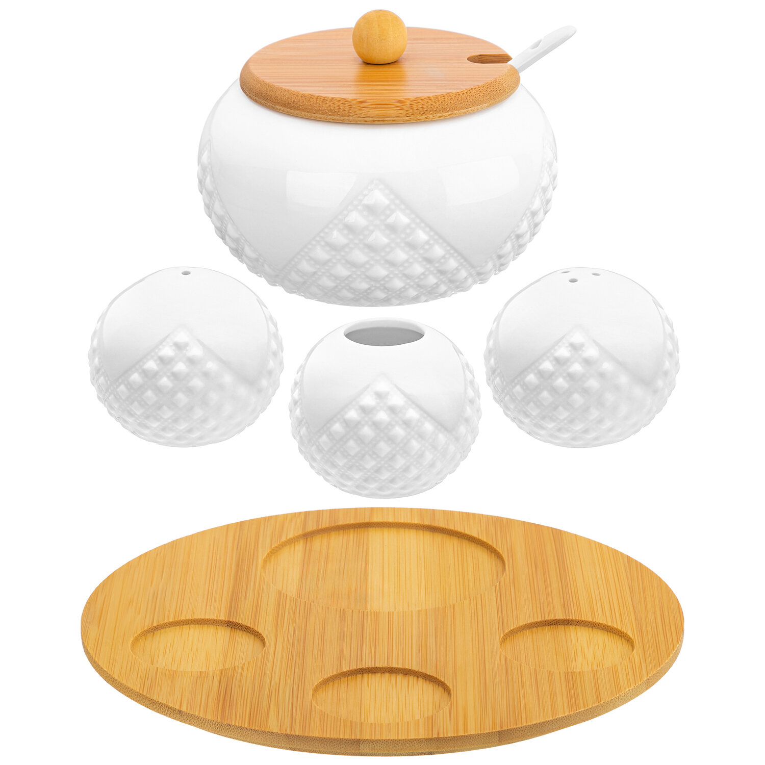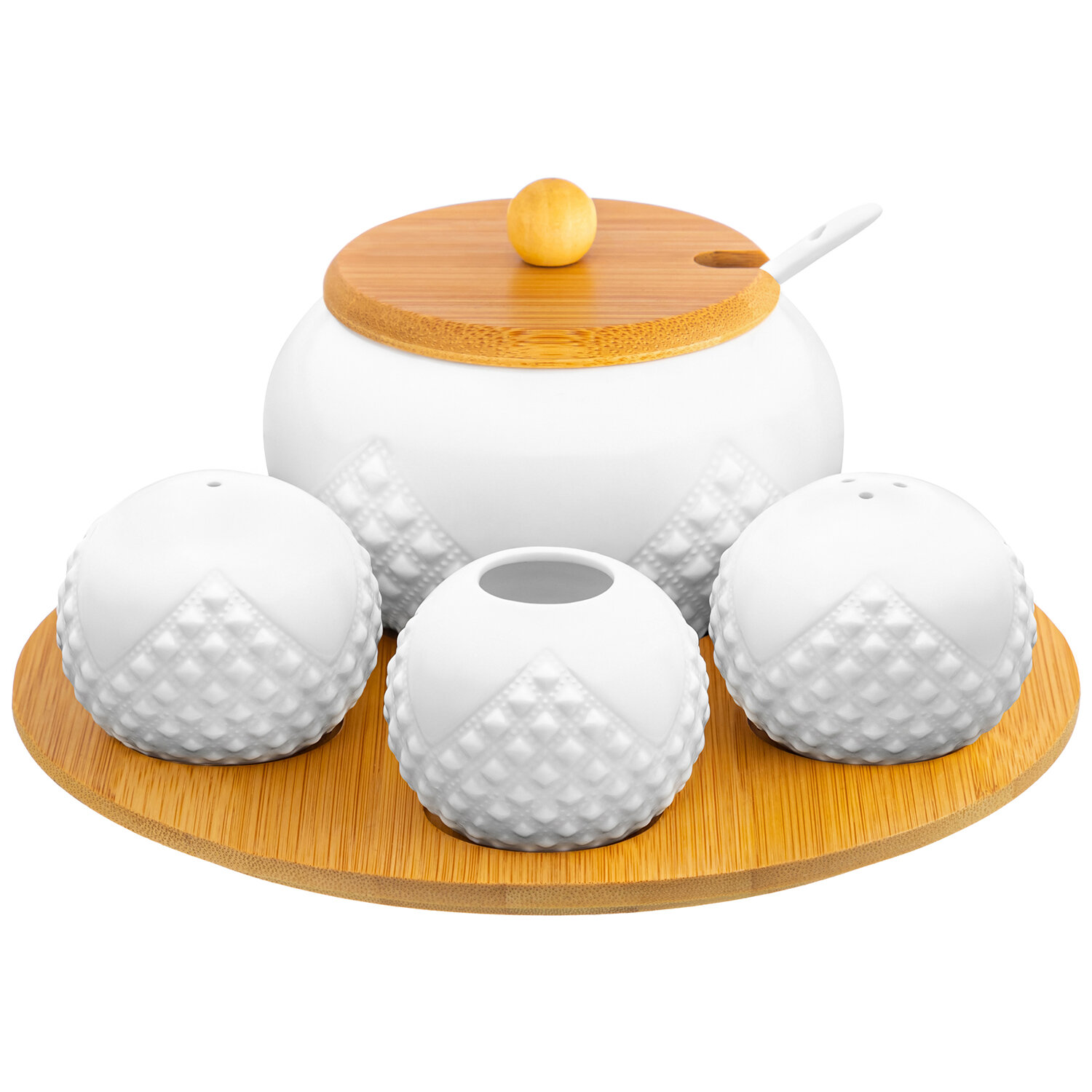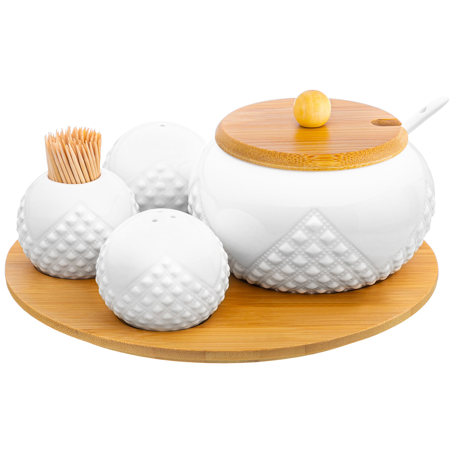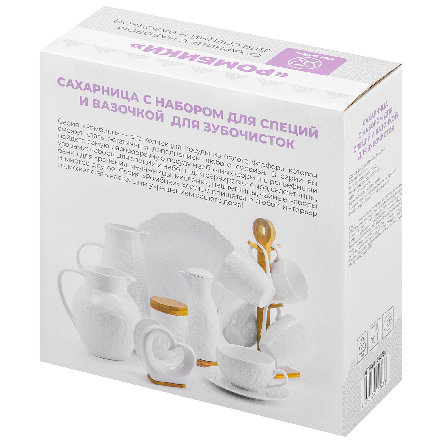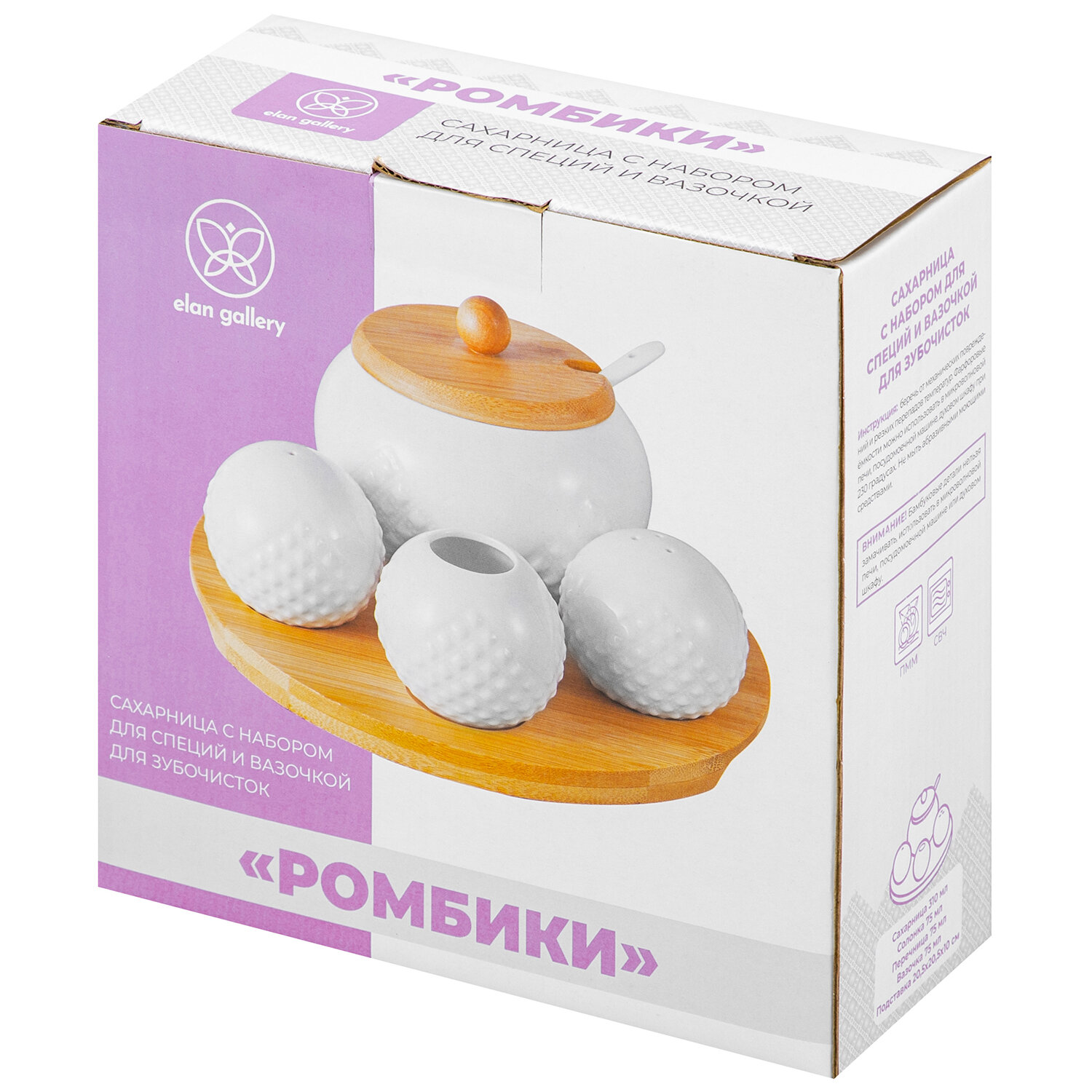 Купить Набор - Сахарница 310 мл Elan Gallery Ромбики с ложкой + вазочка под зубочистки + перечница + солонка на дер. подставке