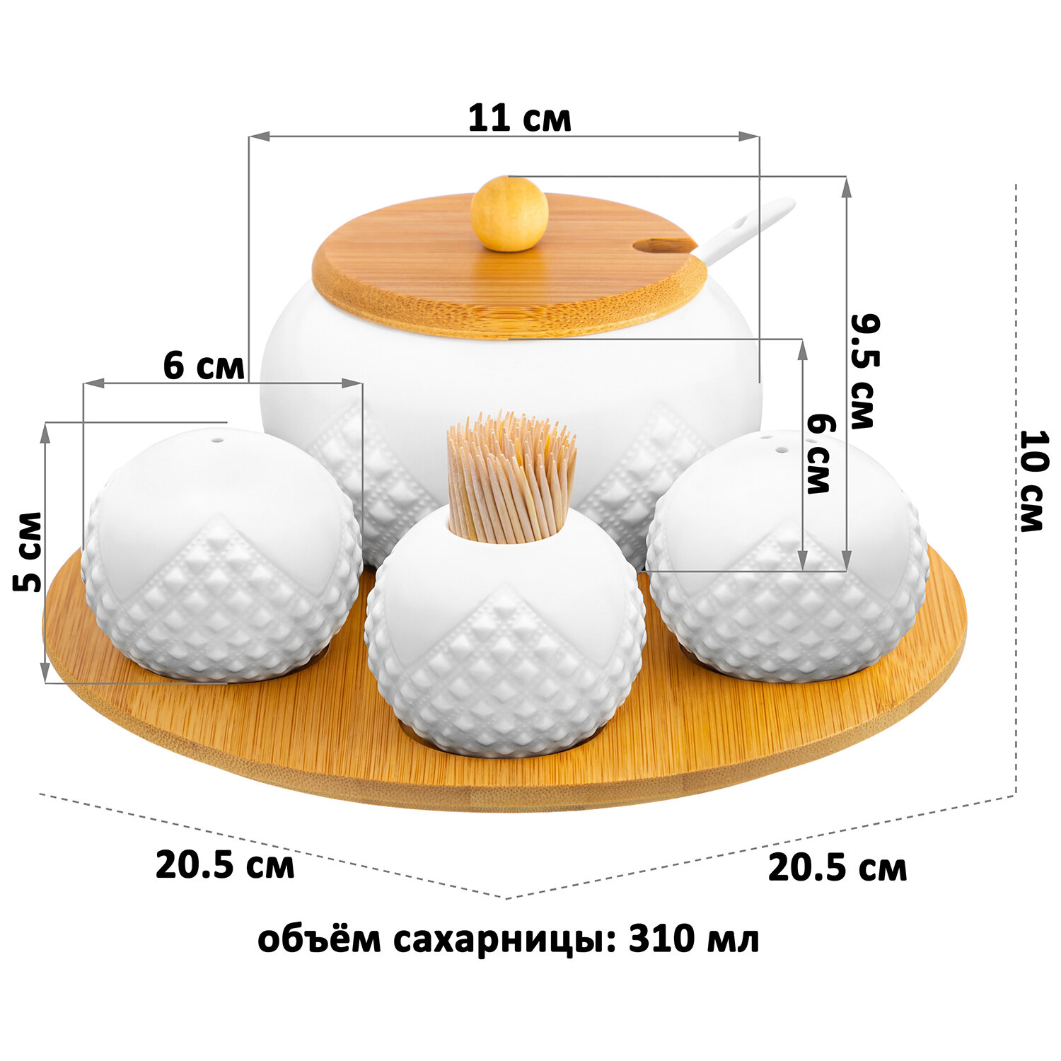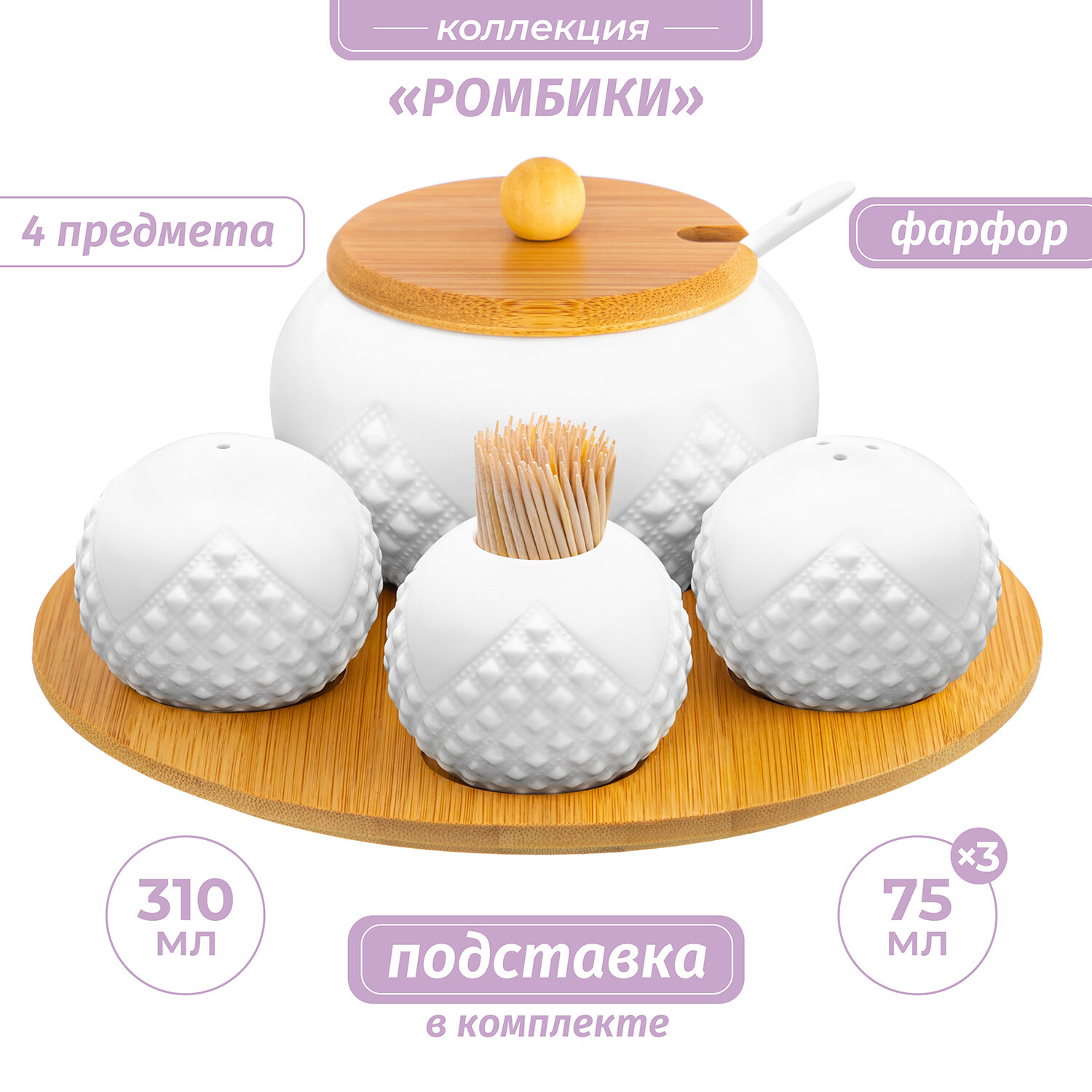 Набор - Сахарница 310 мл Elan Gallery Ромбики с ложкой + вазочка под зубочистки + перечница + солонка на дер. подставке интересное: