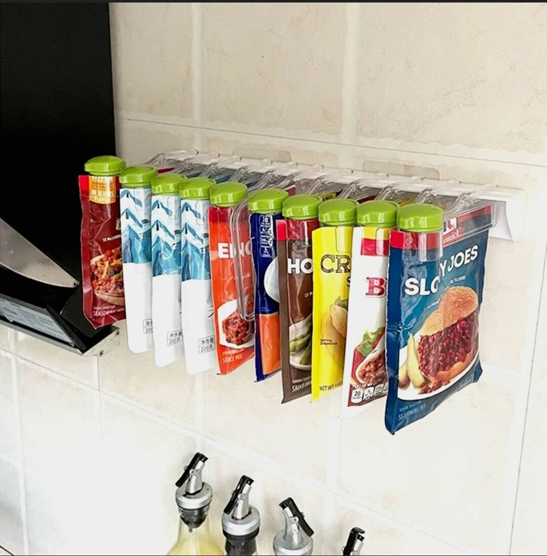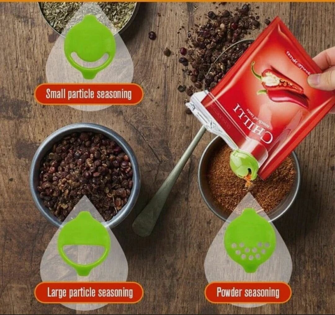 Купить 10 зажимов-держателей для вскрытых пакетов со специями, с крышками- дозаторами.