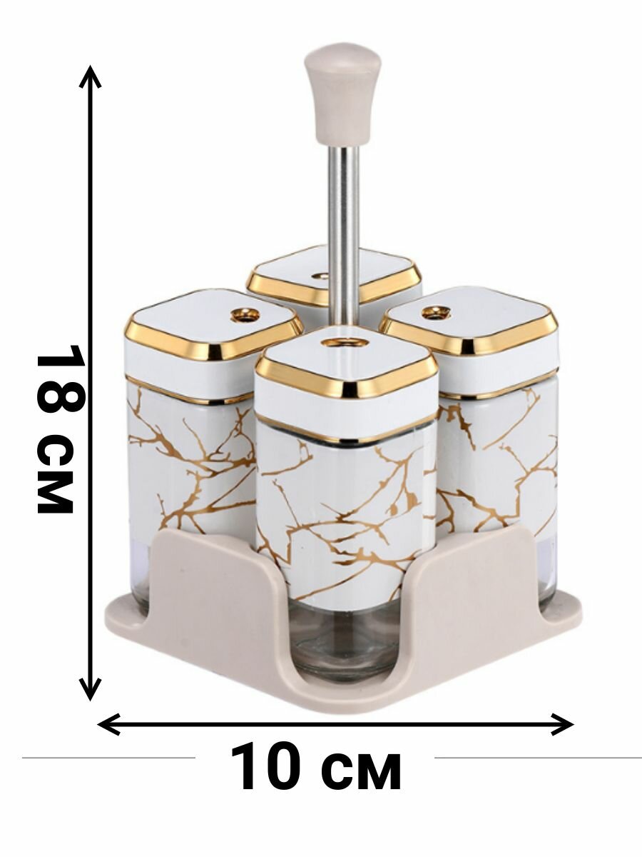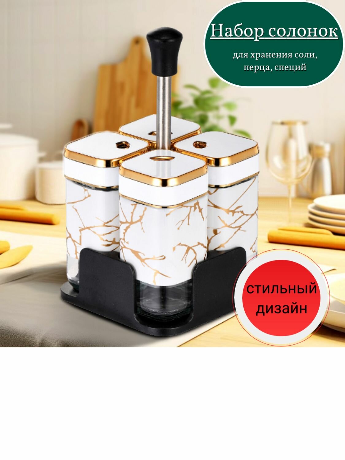 Набор для специй "Мрамор", 4 баночки для приправ на подставке / Солонка, перечница / для соли, перца, специй интересное: