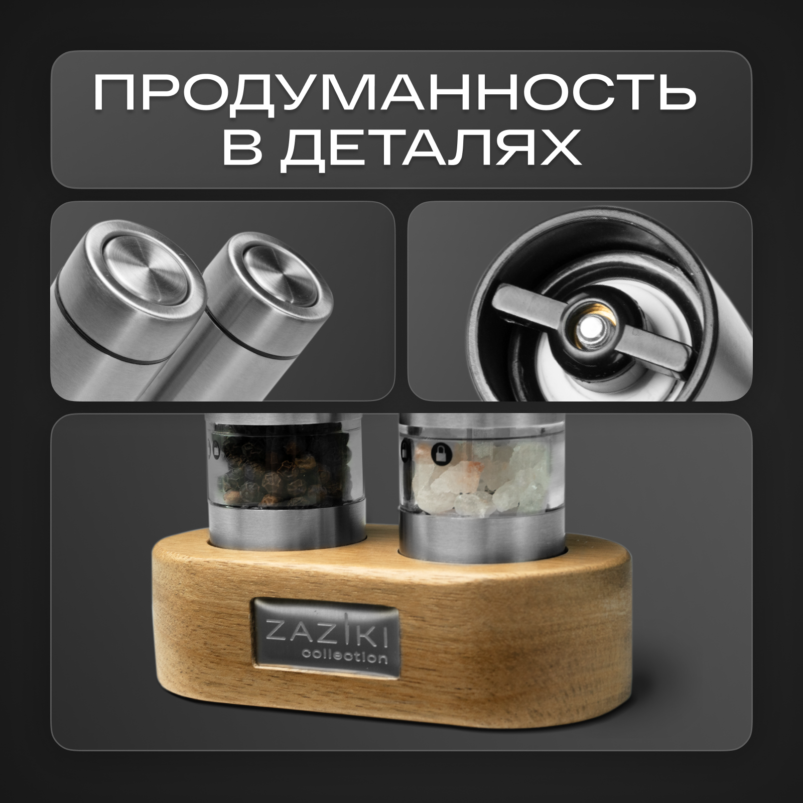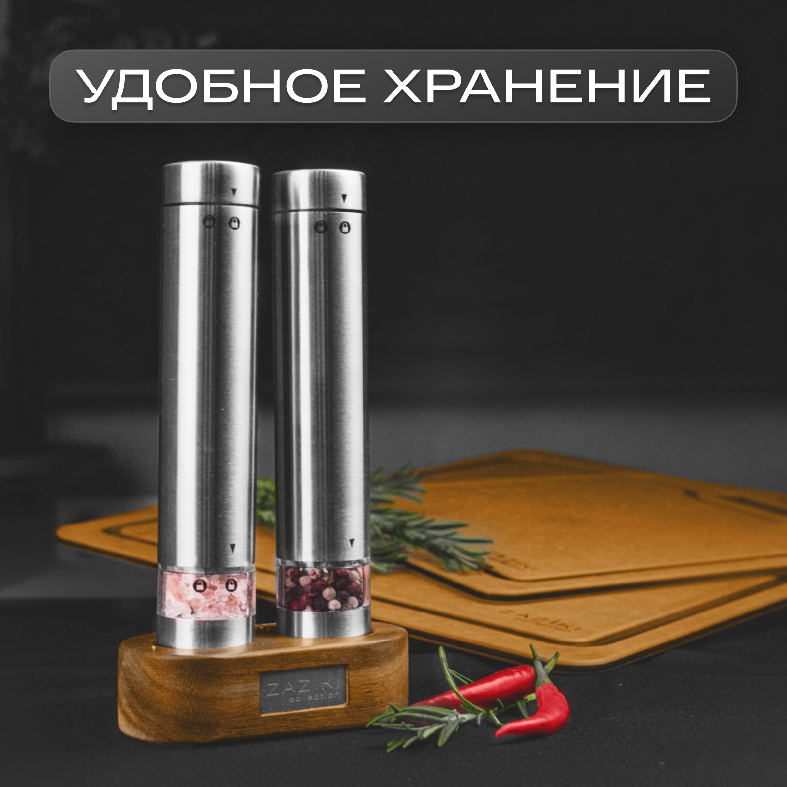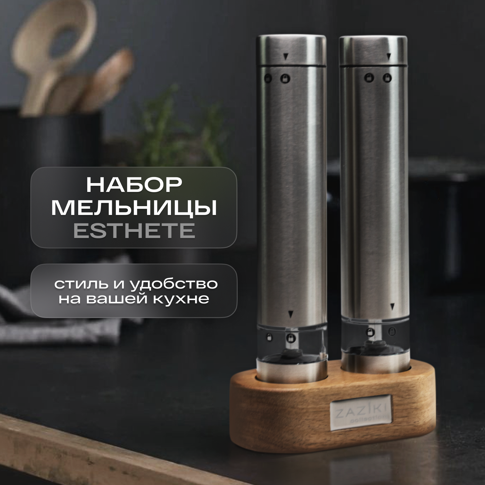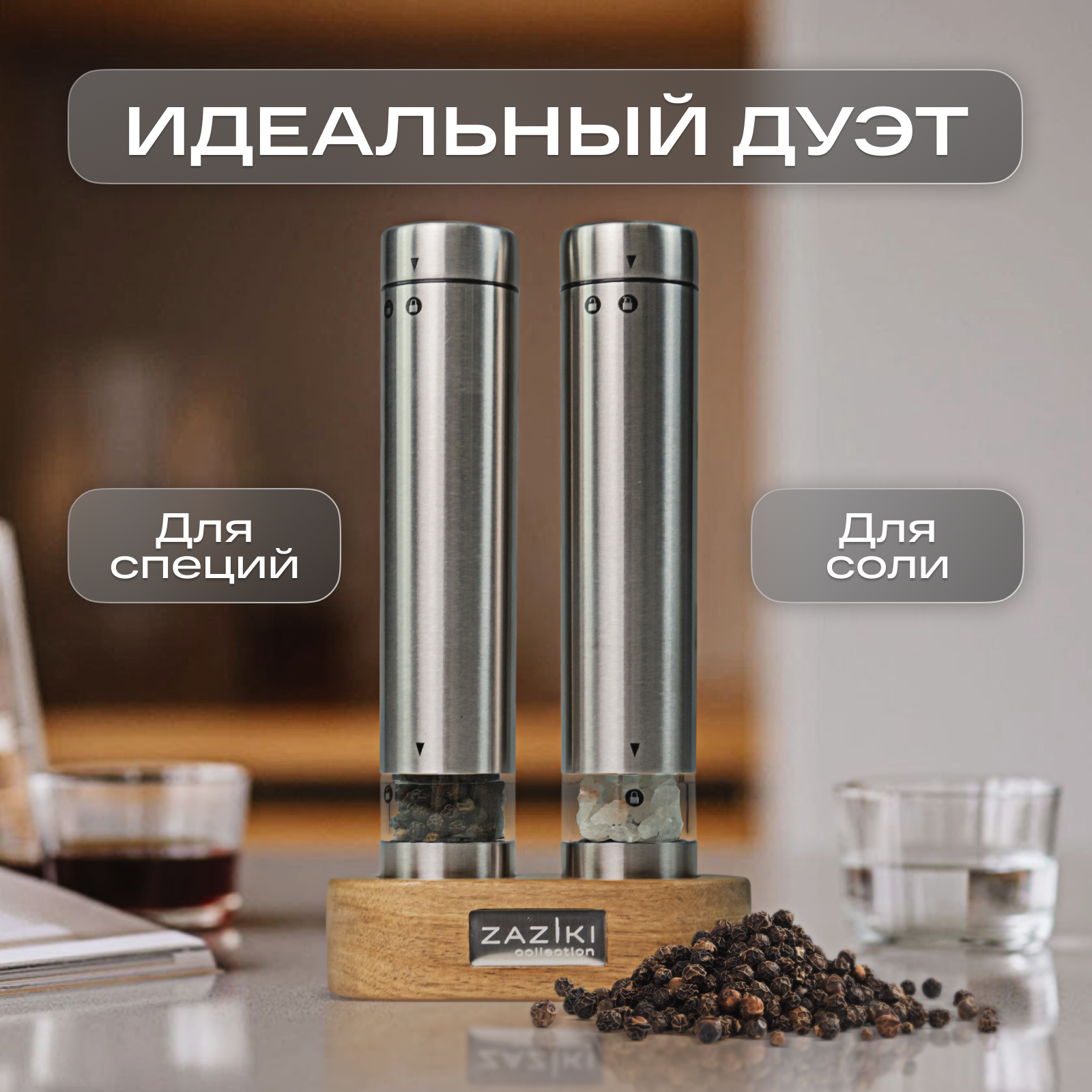 Купить Набор мельниц для специй и соли Zaziki электрические на батарейках, электромельница на деревянной подставке, набор 2 шт