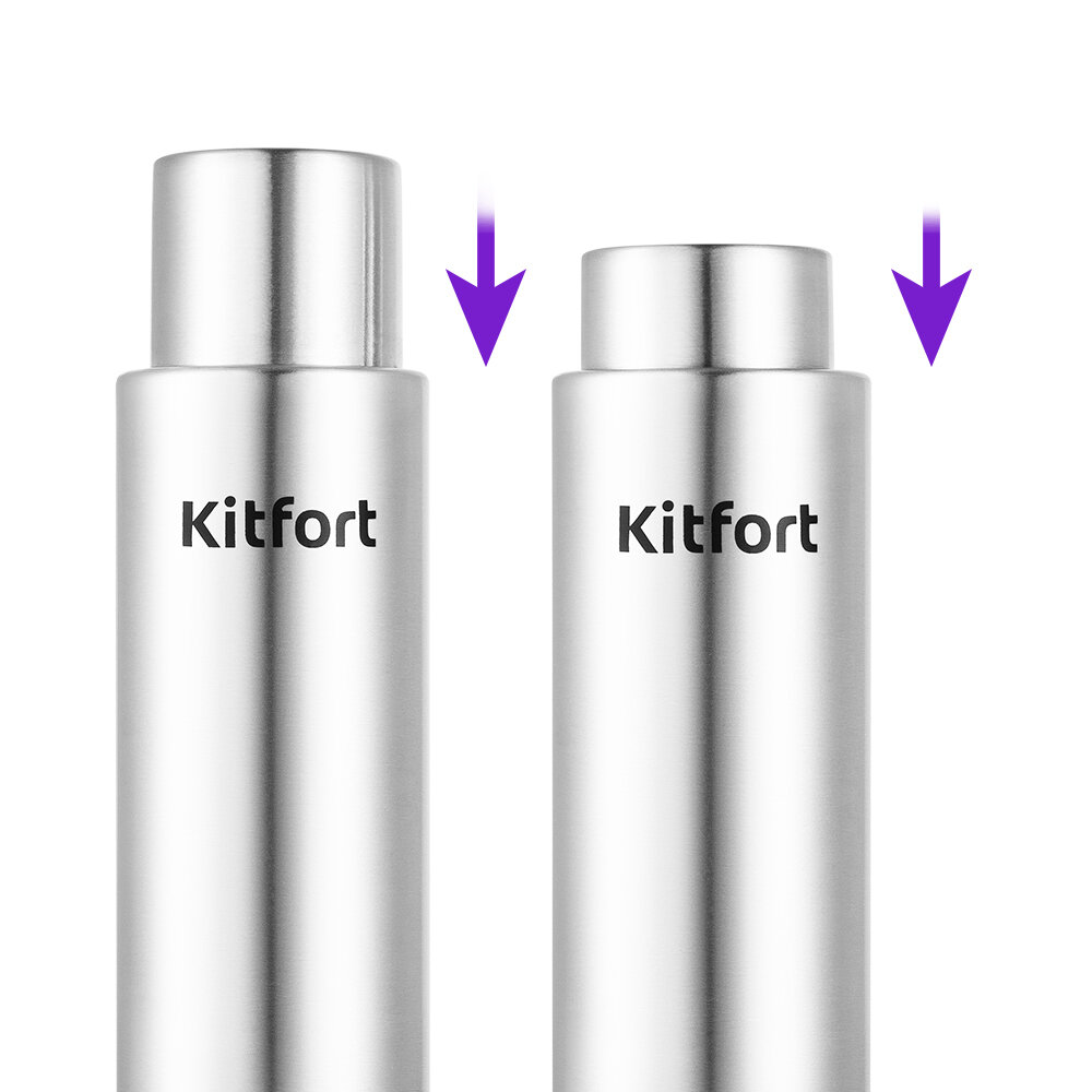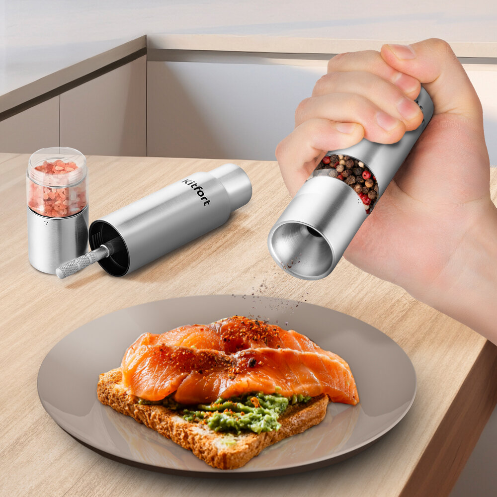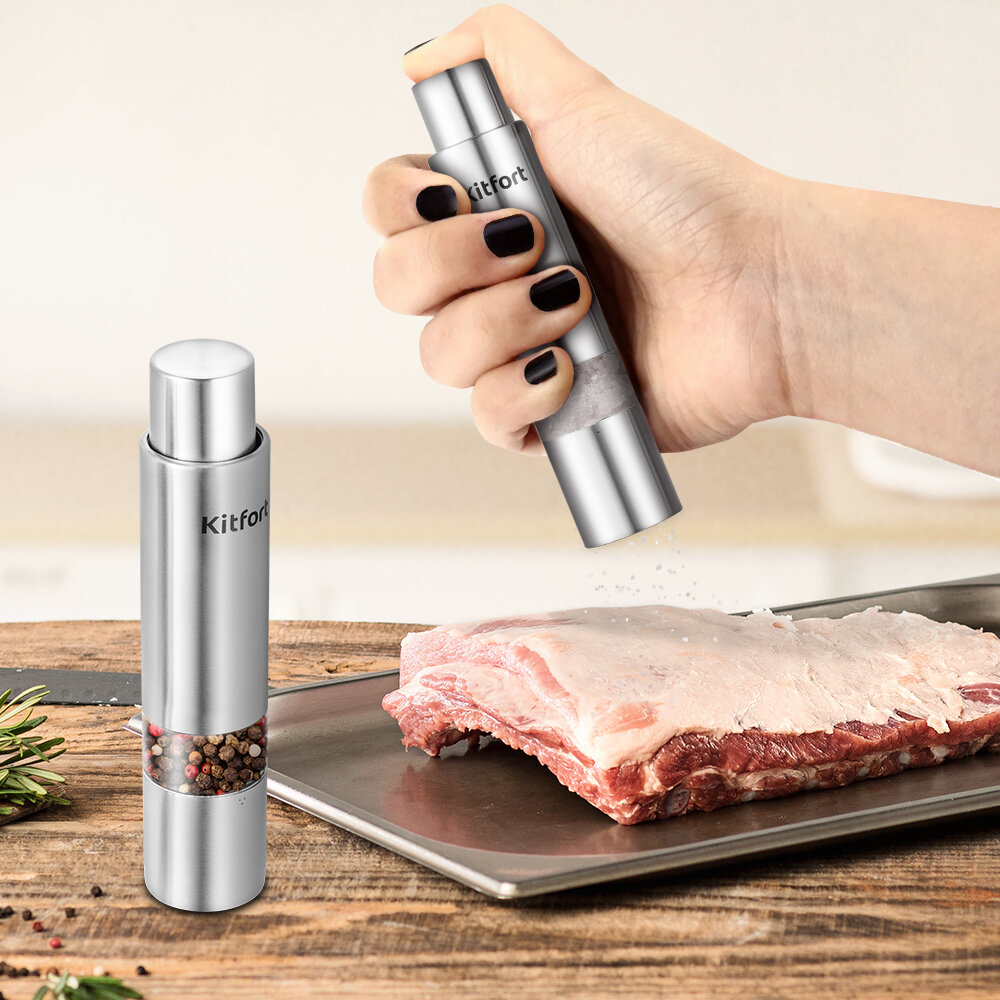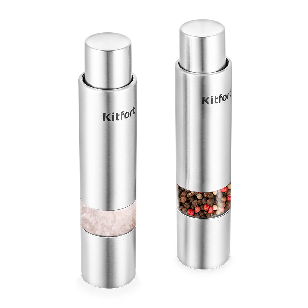 Набор автоматических мельниц для соли и перца Kitfort KT-2028, регулировка степени помола, в комплекте 2 мельницы, цвет серебристый