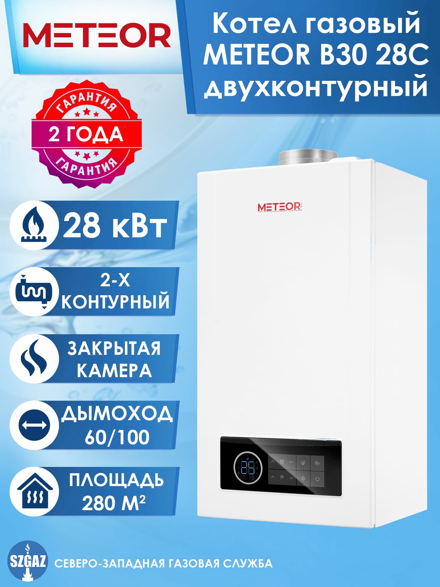СохранитьДвухконтурный газовый котел METEOR B30 28C (28 кВт) с закрытой камерой сгорания, настенный конвекционный турбированный котел метеор 280 кв. м. интересное: