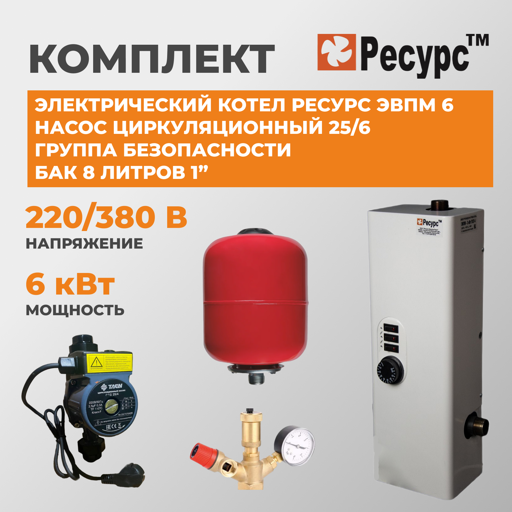 Электрический котел Ресурс ЭВПМ 6 кВт, насос 25/6 (кабель 1,2), Группа безопасности, Бак HT-8V интересное: