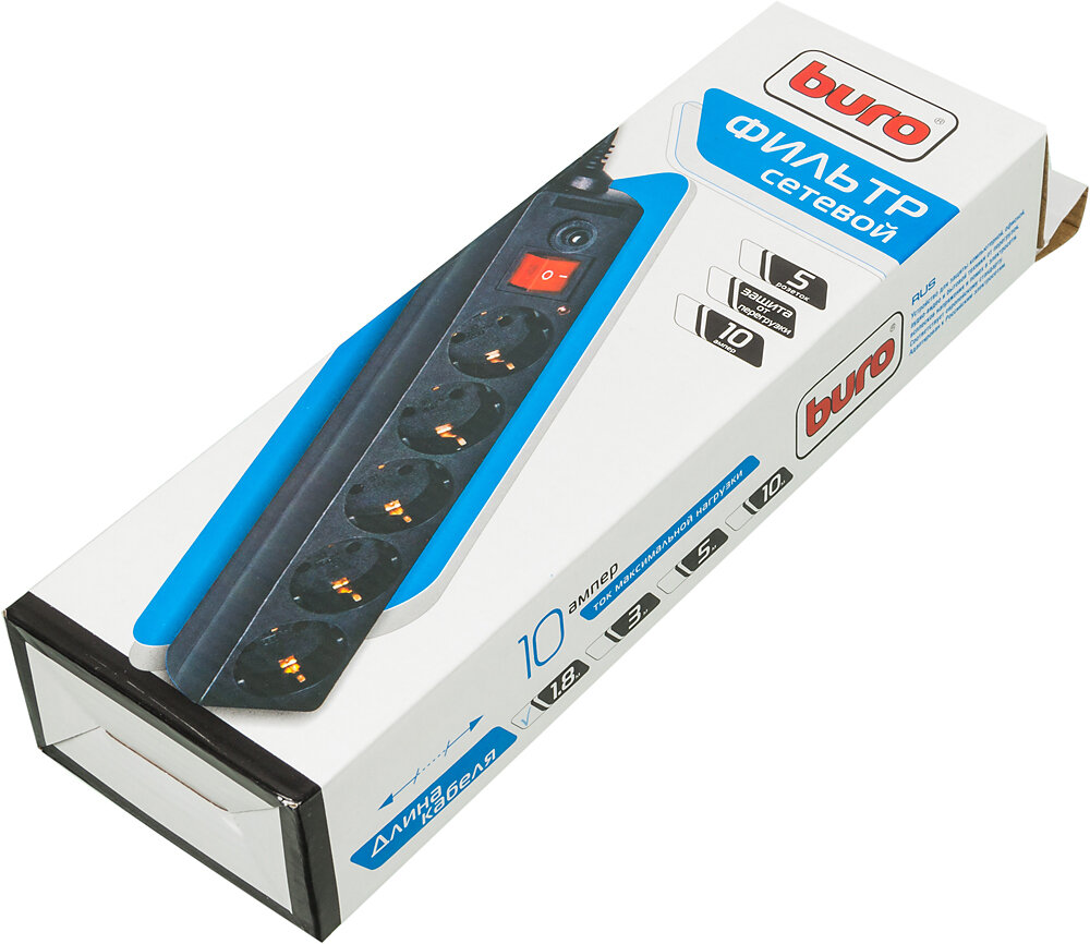 Buro Сетевые фильтры Сетевой фильтр, 5 розеток, 1.8 метра, 500SH-1.8-B , черный коробка