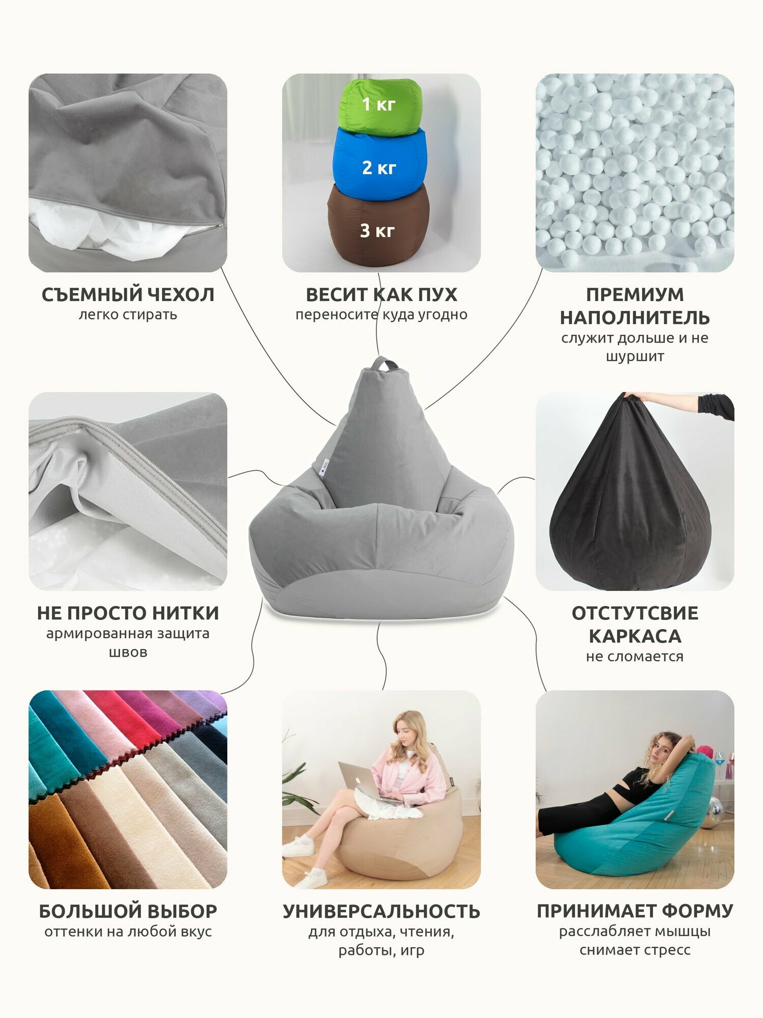 Внешний чехол PUFON для кресла-мешка груша 4XL велюр молочный