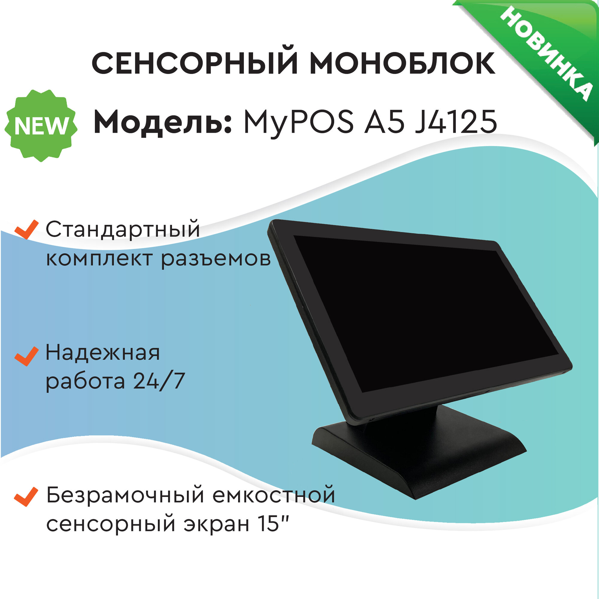 Сенсорный моноблок MyPOS А5 15,6" LCD, J4125, RAM 8Gb, SSD 128Gb, 2 RS232, 6 USB, без MSR, черный интересное: